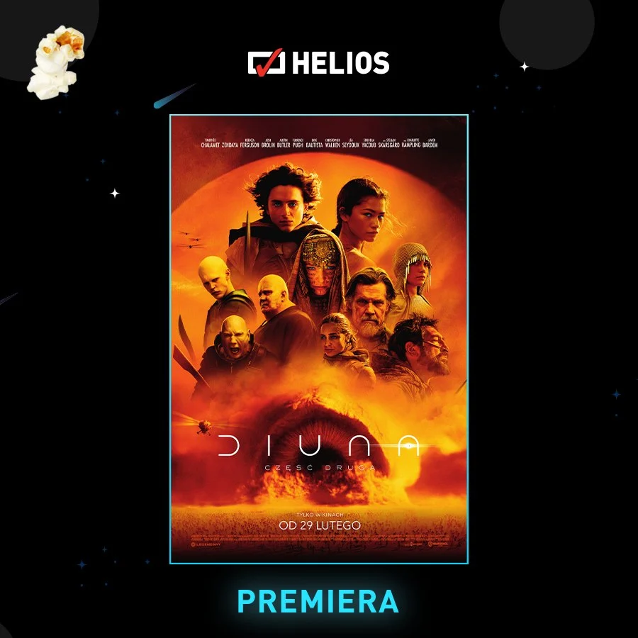 „Diuna: Część druga” to wyczekiwana nowość, która na ekrany trafi w czwartek, 29 lutego. Kontynuacja historii księcia Paula Atrydy niezmiennie fascynuje przedstawieniem uniwersum z gatunku opery kosmicznej. Główny bohater zawiera sojusz z Chani i Fremenami, jak również wkracza na wojenną ścieżkę, chcąc zemścić się na wrogach swojej rodziny. Stając przed wyborem międzymiłością życia a losem znanego wszechświata, Paul pragnie zapobiec tragicznej przyszłości, którą tylko on potrafi przewidzieć. W obsadzie plejada gwiazd: Timothée Chalamet, Zendaya, Austin Butler i wielu innych uwielbianych aktorów! Od piątku, 23 lutego do środy, 28 lutego Helios zaprasza na seanse pierwszej odsłony „Diuny”, które odbędą się w wybranych lokalizacjach sieci.