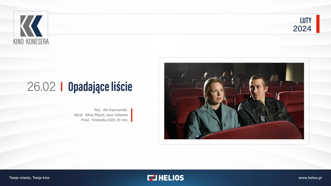 W poniedziałek, 26 lutego, do wybranych kin zawita cykl Kino Konesera, w ramach którego zostanie wyświetlony zaskakujący tytuł wprost z Finlandii – „Opadające liście”. Opowiada on o dwójce nieprzystosowanych do dzisiejszego świata bohaterów, którzy odnajdują w sobie bratnie dusze. Sielankę związaną z rozwojem relacji przerywa jednak rosyjska inwazja na Ukrainę.