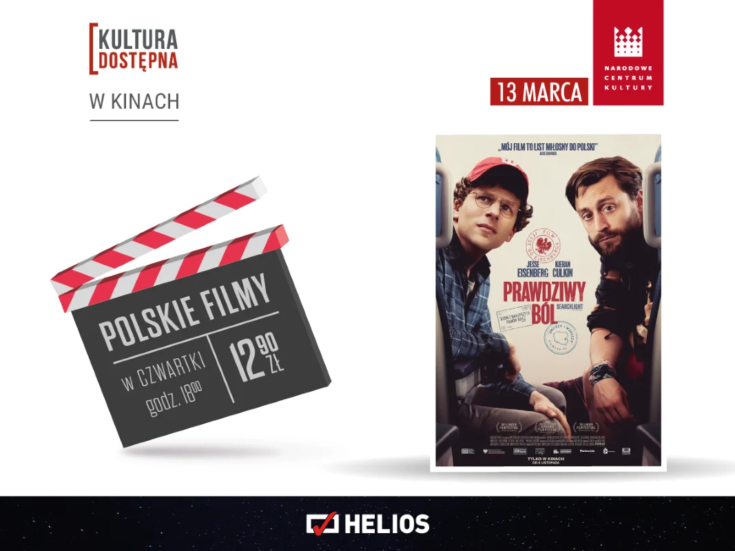 Czwartki to w kinach sieci Helios popołudnia z cyklem Kultura Dostępna. 13 marca zostanie wyświetlony dramat „Prawdziwy ból”, będący koprodukcją amerykańsko-polską. To historia kuzynów: Davida (Jesse Eisenberg) i Benji’ego (Kieran Culkin, nagrodzony za tę rolę Oscarem), którzy razem wybierają się do Polski, aby uczcić pamięć ukochanej babci. Podczas tej podróży odkrywają nie tylko nieznane dotąd miejsca oraz fakty z historii ich rodziny, ale próbują też odbudować trudne relacje.