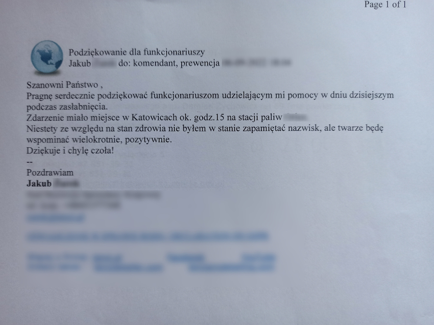 Na ręce Komendanta Miejskiego Policji w Katowicach wpłynęły podziękowania dla policjantów, którzy udzielili pomocy mężczyźnie, kiedy ten zasłabł na jednej ze stacji paliw.