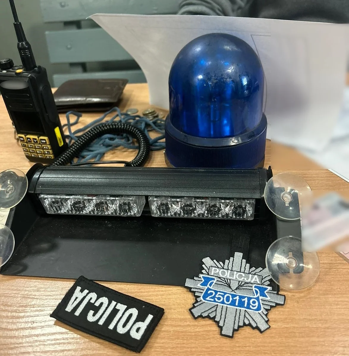 Policjanci z NGW Oddziału Prewencji Policji w Katowicach, patrolując miasto zauważyli na ulicy Warszawskiejw jadącym przed nimi audi a3 zamontowaną na szybie lampę stroboskopową. Postanawiając to sprawdzić, zatrzymali auto do kontroli drogowej. Okazało się, że zamontowana lampa emituje niebieskie sygnały świetlne. W pojeździe mundurowi znaleźli również czapkę z napisem „Policja”, lampę błyskową koloru niebieskiego tzw. kogut, przenośną radiostację, naszywkę z rzepem i napisem „Policja”, a także haftowaną na wzór odznaki policyjnej naszywkę z napisem „Policja” oraz numerem identyfikacyjnym. W trakcie kontroli policjanci natrafili również na strunowy woreczek z białym proszkiem. Badanie narkotesterem wskazało, że jest to amfetamina.