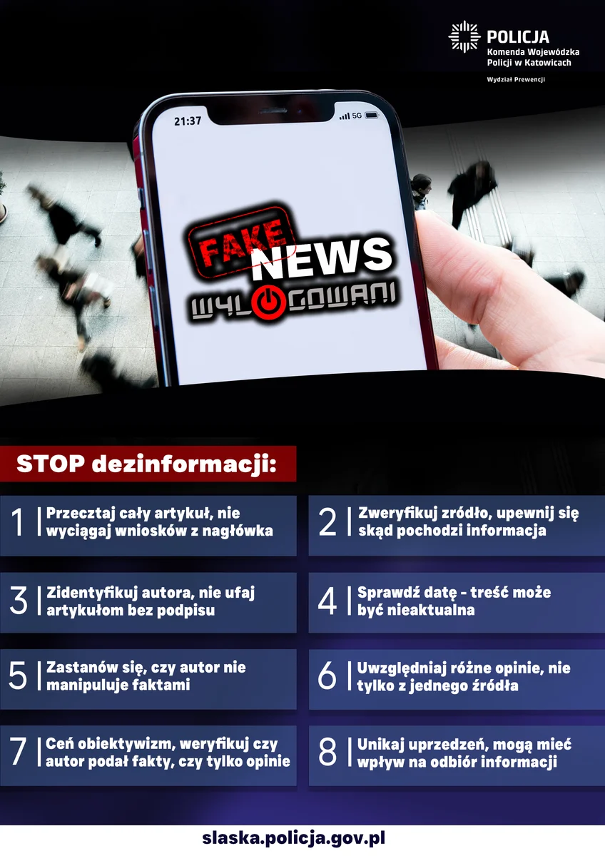 Mając to na uwadze, policjanci, którzy prowadzą kampanię „Wylogowani”, przygotowali i opracowali grafikę z kilkoma podstawowymi zasadami, które mogą pomóc w rozpoznaniu czy otrzymana informacja to prawda, czy fałsz. Przygotowany plakat, oprócz publikacji w sieci, zostanie również przekazany do śląskich komend Policji. Dzięki temu szersze grono odbiorców będzie miało możliwość zapoznania się z treściami edukacyjnymi.