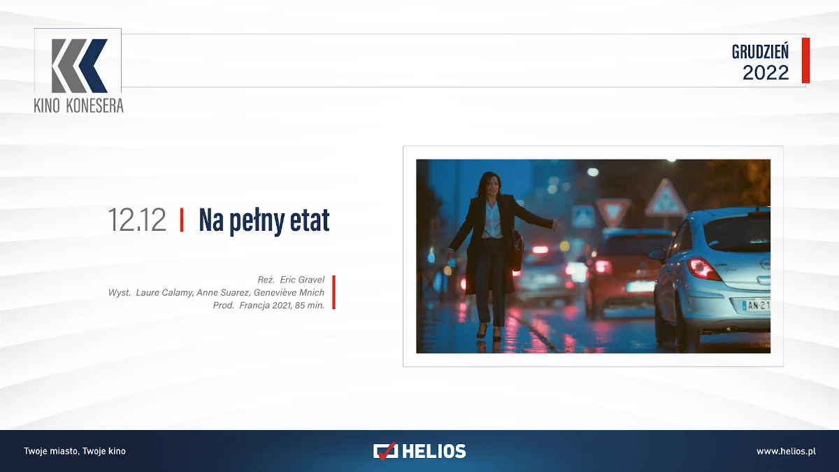12 grudnia w cyklu Kino Konesera zaprezentowany zostanie francuski dramat obyczajowy „Na pełny etat”. Marie dokłada starań, by pogodzić wychowanie dwójki dzieci z pracą w jednym z luksusowych paryskich hoteli. Nie jest to łatwe, zwłaszczaże mieszka poza miastem, a codzienne dojazdy zajmują jej sporo czasu w i tak napiętym już grafiku. Kiedy otwiera się przed nią szansa awansu, wybucha strajk…