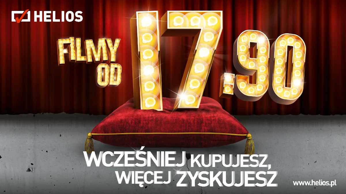 Filmowe emocje to wspaniały pomysł na niezapomniany czas w gronie rodziny oraz przyjaciół. Po bilety Helios zaprasza na stronę www.helios.pl oraz do kinowych kas. Warto przy tej okazji pamiętać o ofercie „Wcześniej kupujesz, więcej zyskujesz”, gwarantującej wybór najlepszych miejsc w sali, a także najbardziej korzystne ceny biletów.