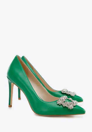 Jaki model warto kupić z myślą o przyjęciu weselnym? Strzałem w dziesiątkę będą szpilki damskie skórzane z efektowną klamrą. Jeżeli chcesz nieco zaszaleć, wybierz model w najmodniejszym kolorze tego sezonu, czyli zielonym. Szpilki wykonane z wysokogatunkowej skóry naturalnej są wygodne, i to mimo dość wysokiego obcasa (9 cm). Komfort zapewnia wkładka ze skóry naturalnej z miękką wyściółką.