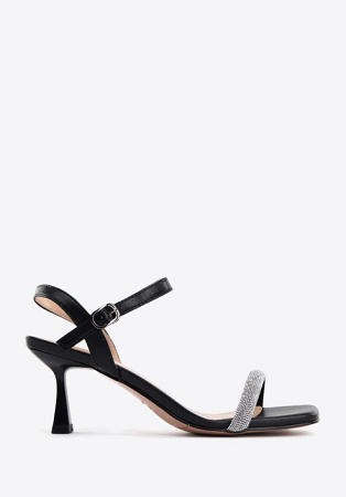 Jeśli przyjęcie weselne jest zaplanowane na sezon wiosna-lato, możesz postawić na nieco mniej oczywiste sandały. Niejedno spojrzenie przyciągną czarne sandały na szpilce z eleganckim paskiem wysadzanym drobnymi diamencikami. Buty mają oryginalny, lekko rozszerzający się ku dołowi obcas i są bardzo stabilne, co sprawia, że każda kobieta będzie czuła się w nich pewnie. Zaletą tego modelu jest również skórzana wkładka z miękką wyściółką.