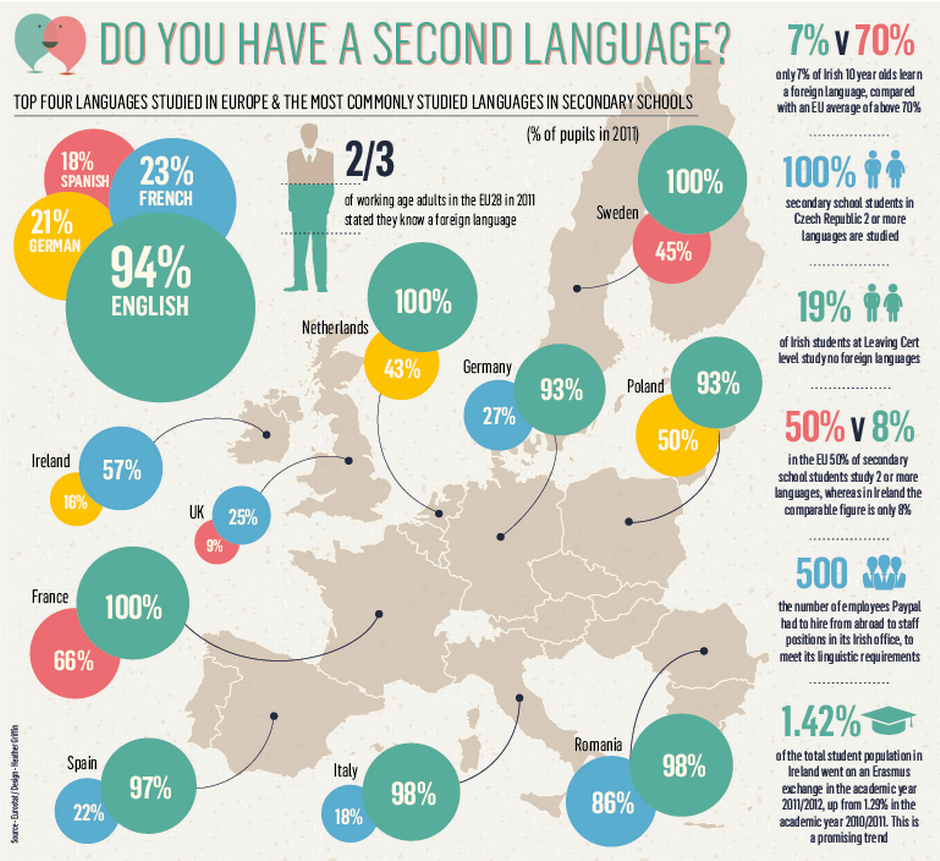 Dzięki wprowadzeniu obowiązku nauki języka angielskiego w szkołach podstawowych orz egzaminów językowych w formie matury z języka obcego, młodepokolenie Polaków jest jednym z najbardziej wyedukowanych językowo spośród Europejczyków. Wielu Niemców, Brytyjczyków czy Hiszpanów jest rozleniwionych faktem, iż w  swoim ojczystym jeżyku są w stanie się porozumieć bez większych problemów. Polacy tej możliwości nie mają, stad nacisk na edukacje językową. W Polsce język angielski stał się umiejętnością wymaganą w zasadzie wszędzie nie tylko w pracy, szkole, ale i towarzystwie, z drugiej zaś strony jest też umiejętnością bardzo powszechną i zaczynającą być porównywalną z umiejętnością liczenia, czy czytania. Fenomen język angielskiego powoli zaczyna być przełamywany zainteresowaniem wieloma innymi, konkurencyjnymi językami świat, w szczególności Europy Zachodniej. Zwykle nauka języka niemieckiego, hiszpańskiego tonauka języka kolejnego z rzędu, za angielskim lub równolegle z nim.