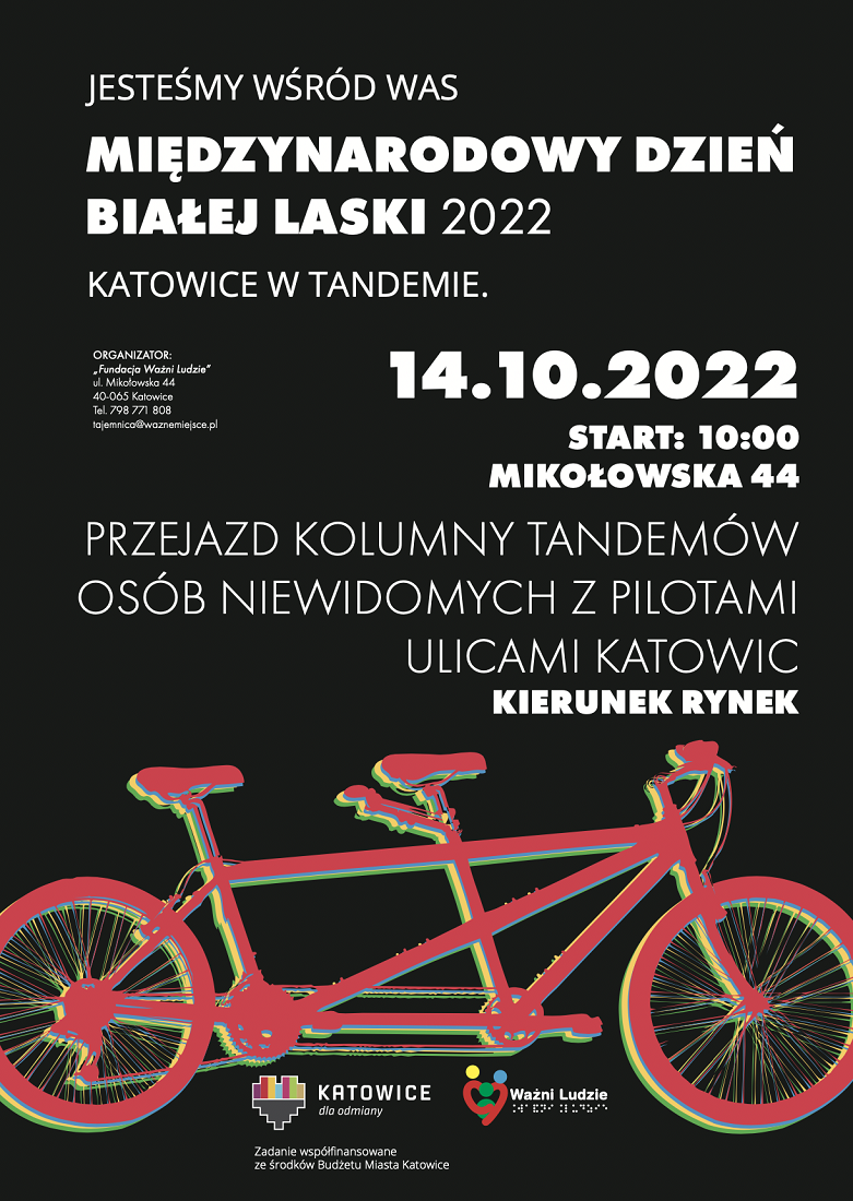 Planowany jest przejazd kolumny tandemów ulicami Katowic. Każdym rowerem będzie poruszać się para – osoba widząca jako pilot i osoba niewidoma.