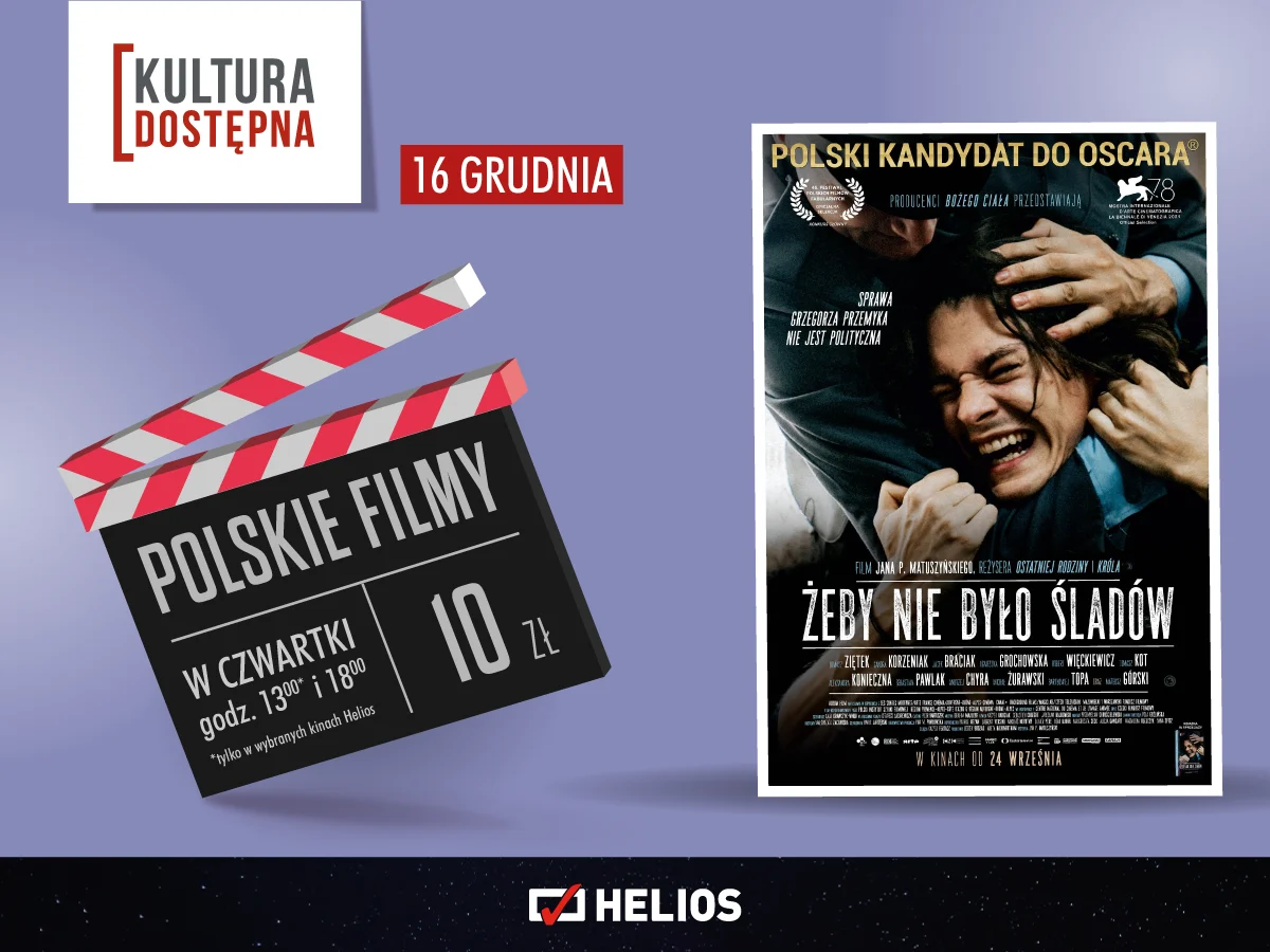 Na miłośników mocnych wrażeń i wielkiego kina czeka propozycja polskiego kandydata do Oscara „Żeby nie było śladów” w reżyserii Jana P. Matuszyńskiego. Film zostanie wyświetlony w ramach cyklu Kultura Dostępna 16 grudnia. Historia tragicznej śmierci Grzegorza Przemyka z plejadą gwiazd polskiego kina to film opatrzony znakiem „Stop nie przegap”.