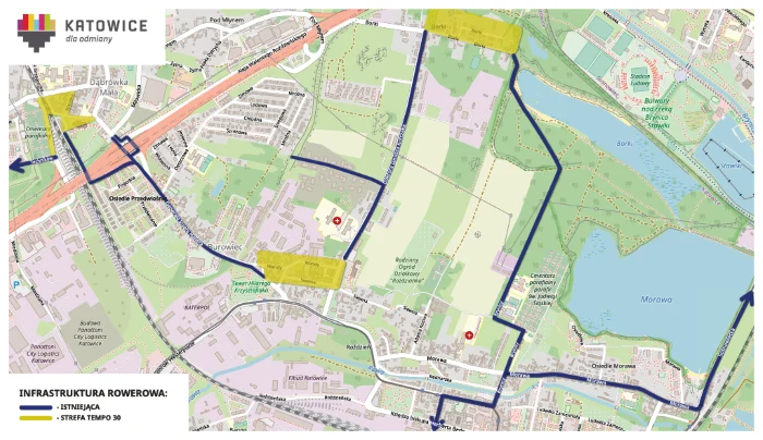 Wybudowany właśnie blisko kilometrowej długości odcinek infrastruktury rowerowej poprowadzony został wzdłuż ul. Morawa, pomiędzy skrzyżowaniami z ul. Brynicy oraz z ul. Sosnowiecką. Nowa droga łączy istniejące odcinki wzdłuż tych dwóch ulic tworząc spójny, całkiem spory fragment sieci. Dzięki niej rowerzysta może przejechać przygotowaną dla niego trasą od stawu Morawa aż do Doliny Trzech Stawów lub w kierunku Giszowca, gdzie – po krótkiej przejażdżce w ruchu ogólnym – dotrze do początku pierwszej katowickiej velostrady.