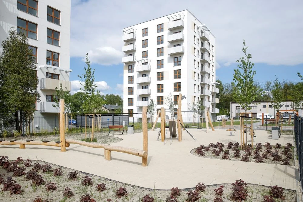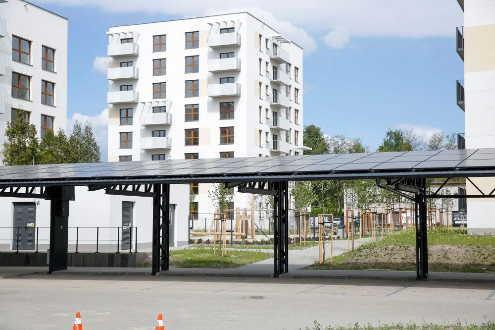 Na atrakcyjność nowego osiedla komunalnego z pewnością wpływają zastosowane tu udogodnienia, jak choćby ogrzewanie podłogowe, balkony i tarasy, plac zabaw dla najmłodszych i przestrzeń rekreacyjna, gdzie można odpocząć w wolnym czasie. W trakcie projektowania nowego osiedla zastosowano też wiele ekologicznych technologii. Wykorzystano m.in. niskoemisyjny cement, co zapewnia o 20 proc. niższy ślad węglowy w porównaniu z tradycyjnymi metodami oraz pompy ciepła, które efektywnie pozyskują energię z otoczenia. Na dachach znajduje się też instalacja fotowoltaiczna. Panele słoneczne zostały zamontowane również na dachu wiaty samochodowej, znajdującej się w środku osiedla.