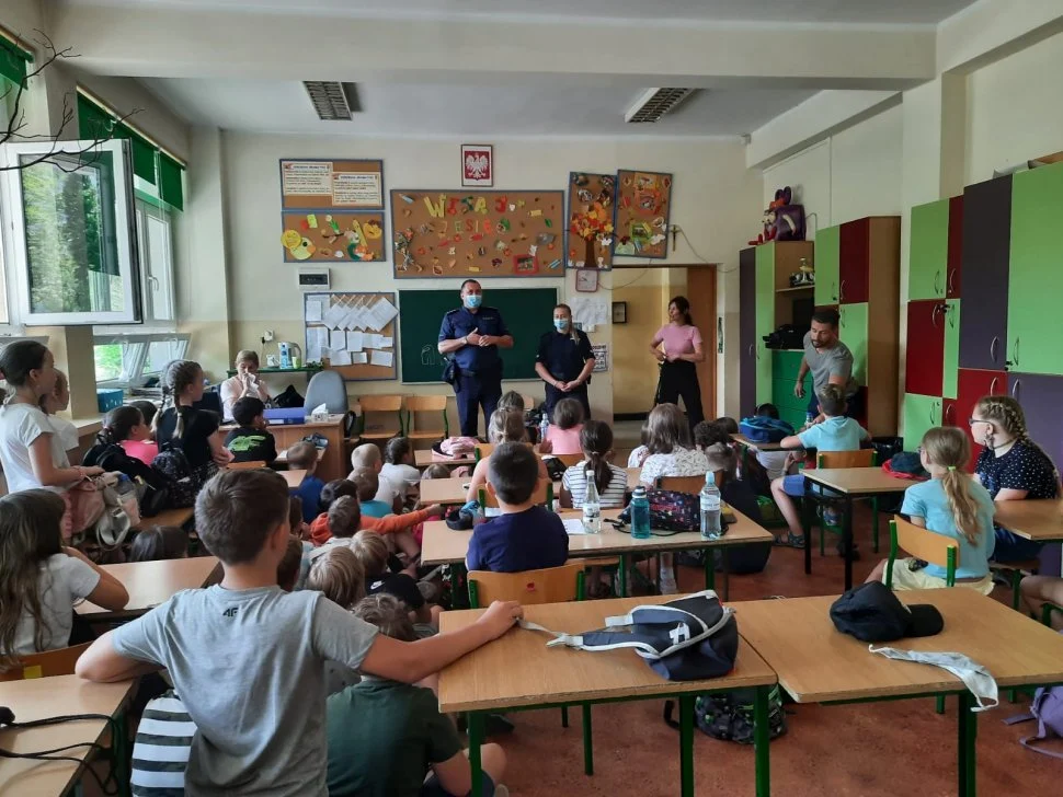 Tym razem dzielnicowi z Komisariatu VII Policji w Katowicach spotkali się z dziećmi i młodzieżą spędzającą letni wypoczynek w mieście. W ramach „Bezpiecznych wakacji” sierż. szt. Sylwia Michalak, asp. szt. Tomasz Sołtysiak odwiedzili uczniów Szkoły Podstawowej nr 59 w Katowicach uczęszczających na półkolonie. Tematem przewodnim było bezpieczeństwo podczas wakacji, ze szczególnym uwzględnieniem spędzania czasu nad wodą. Policjanci w czasie spotkania przypomnieli uczestnikom, o najbardziej uniwersalnych zasadach, których przestrzegania pozwoli być bezpiecznym. Należy pamiętać o tym, że: