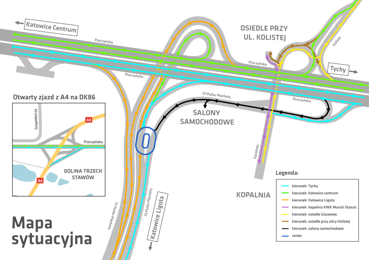 Przyspieszona zmiana w organizacji ruchu oznacza, że kierowcy ponownie będą mogli korzystać z przejazdu z osiedla Giszowiec a także z DK86 od strony Tychów – na osiedle przy ulicy Kolistej oraz umożliwi to dojazd do skrzyżowania ulicy Kolistej z ul. Karolinki i 73 Pułku Piechoty. Tym samym węzeł Kolista zostanie w pełni udostępniony dla ruchu. Skorzystają na tym również pasażerowie transportu publicznego. Trasy autobusów już nie będą prowadzone objazdami, co skróci czas przejazdu i usprawni komunikację z osiedlem. Razem z udostępnieniem całego węzła, uruchomiony zostanie również ciąg pieszy wzdłuż drogi.