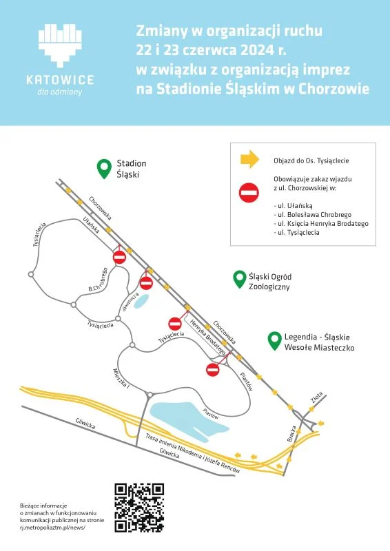 Ponadto 22 i 23 czerwca, wzdłuż ul. Chorzowskiej – na odcinku od ul. Złotej do granicy z Chorzowem, zostaną wprowadzone dodatkowe zakazy zatrzymywania i postoju. Analogiczne oznakowanie zostanie wprowadzone na ul. Brackiej od Drogowej Trasy Średnicowej do ul. Chorzowskiej.