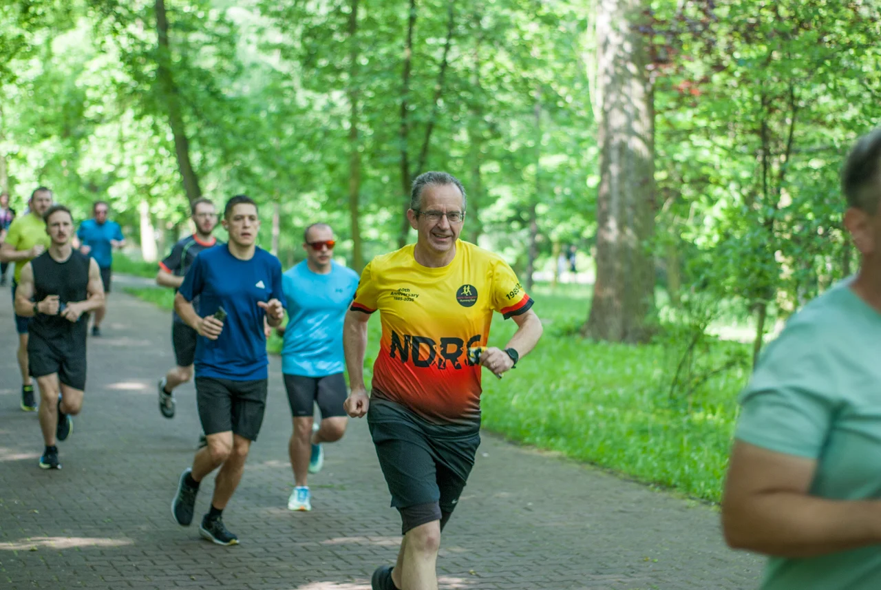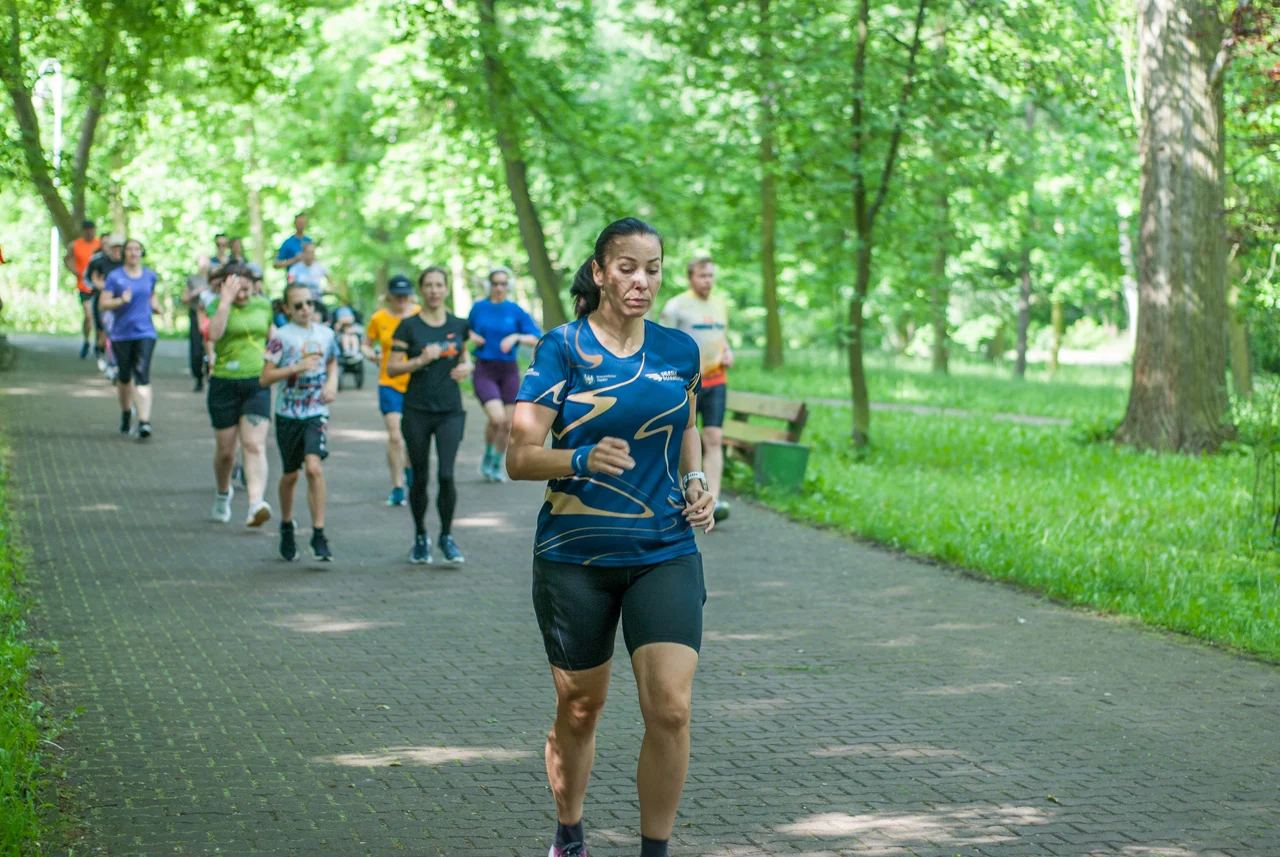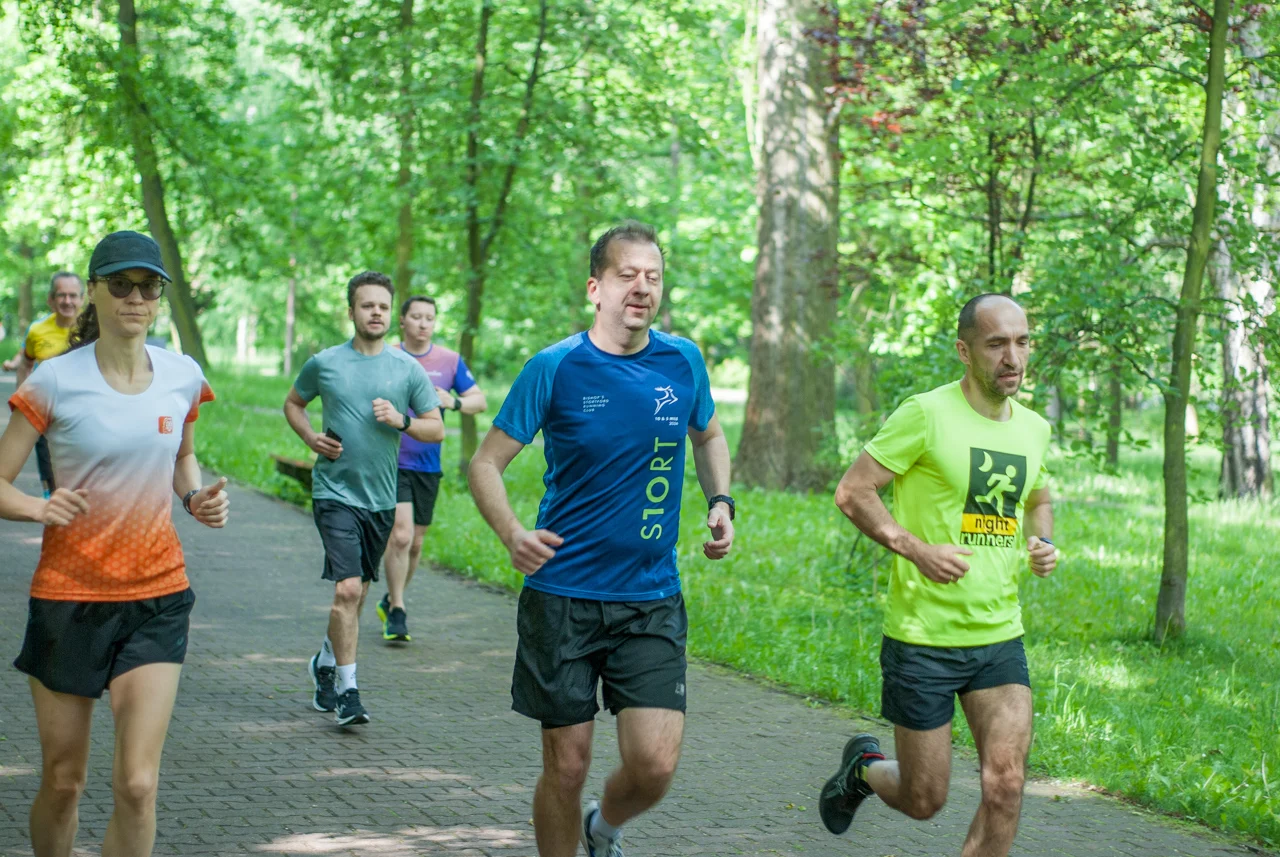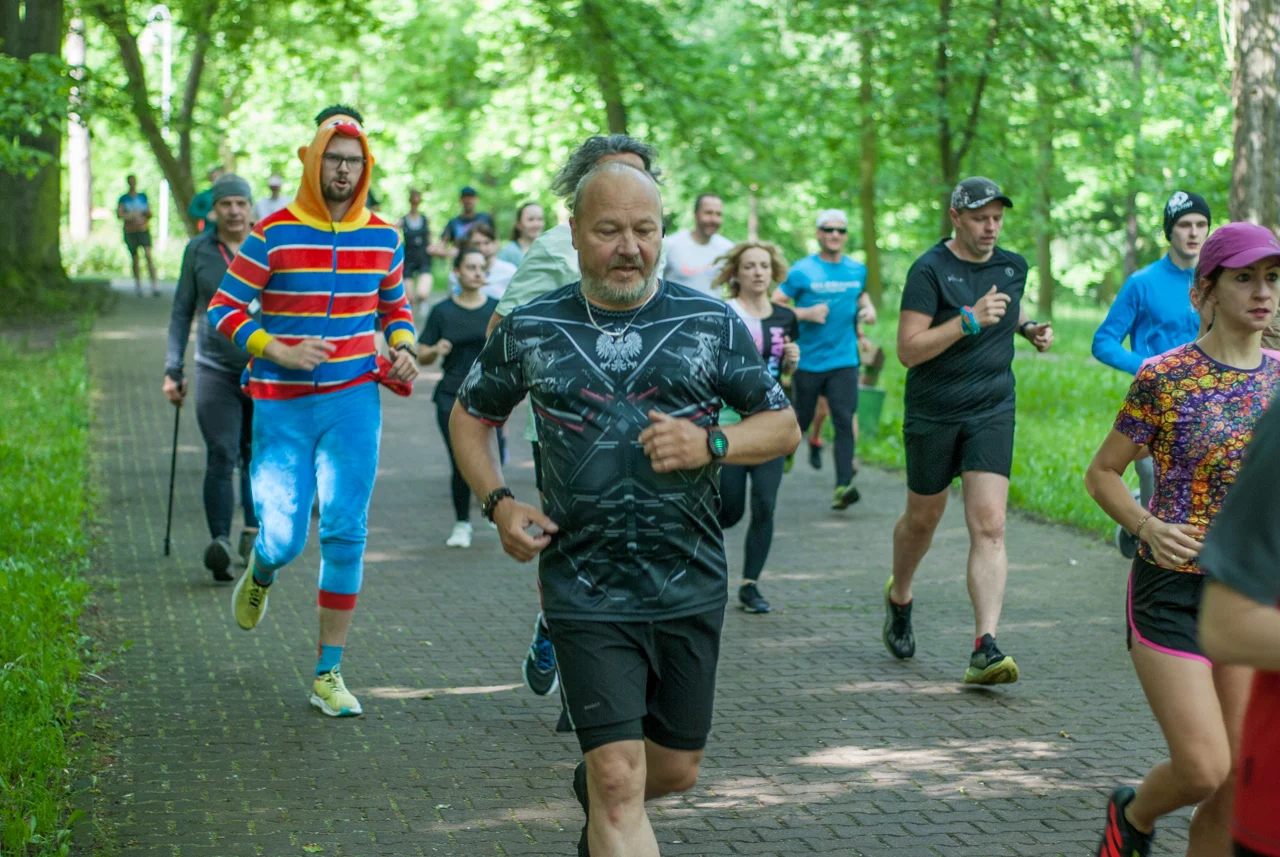 Kilka minut po odprawie debiutantów, strzelono sobie tradycyjne wspólne zdjęcie. Na samym początku odbył się bieg dedykowany najmłodszym uczestnikom, prowadzony po pętli w centralnej części parku. Główny peleton ruszył na trasę prowadzącą zielonymi (w końcu!) alejkami w parku Kościuszki chwilę po godzinie 9. W spotkaniu wzięła udział mniej więcej setka uczestników.