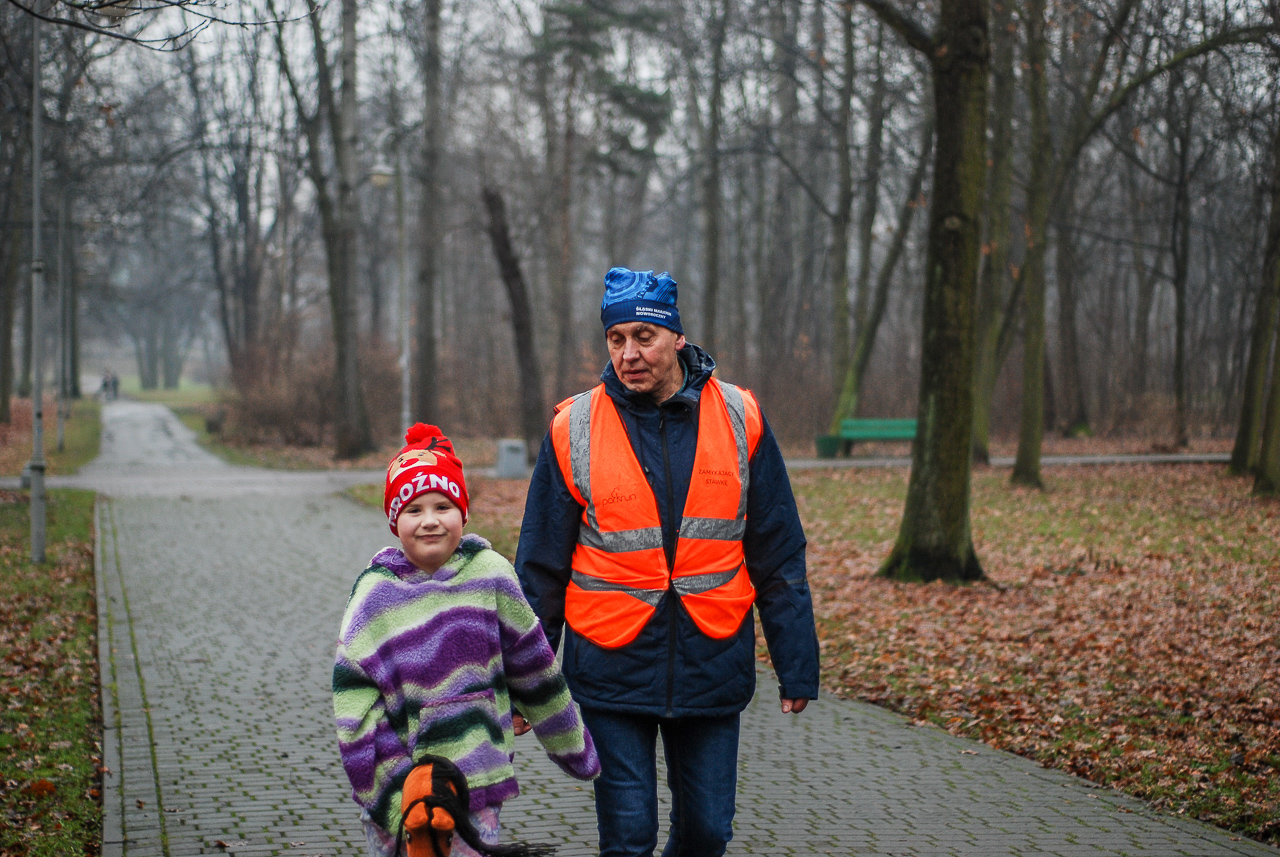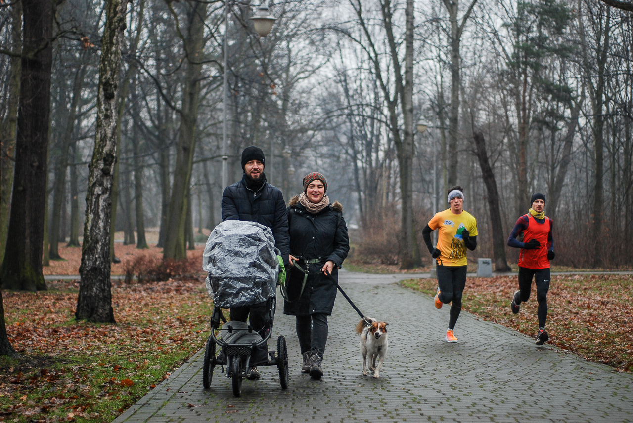 Kilkadziesiąt osób, w każdym wieku, a także kilku psich towarzyszy pobiegło dziś, jak zawsze, alejkami Parku Kościuszki. Kolorowy tłum  wspierany przez peacemakerów (ludzi nadających tempo biegu), zmagał się z trasą biegu.