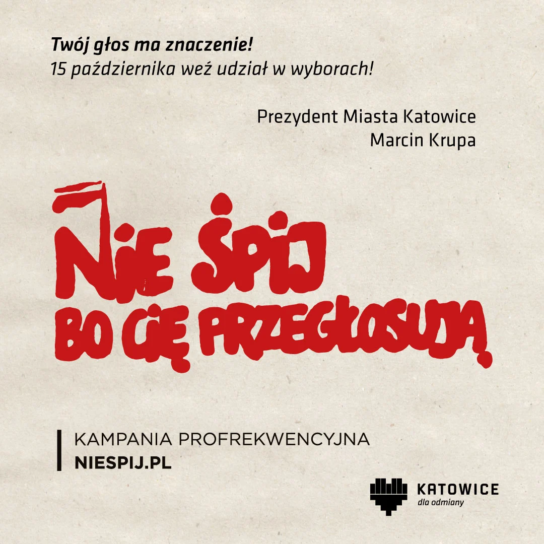 Katowice, podobnie jak inne samorządy, włączają się w społeczną kampanię profrekwencyjną Unii Metropolii Polskich, która odbywa się pod hasłem #NieŚpijBoCięPrzegłosują.