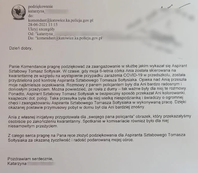 Na ręce Komendanta Miejskiego Policji w Katowicach wpłynęły podziękowania dla dzielnicowego asp. szt. Tomasza Sołtysiaka z Komisariatu VII Policji w Katowicach.