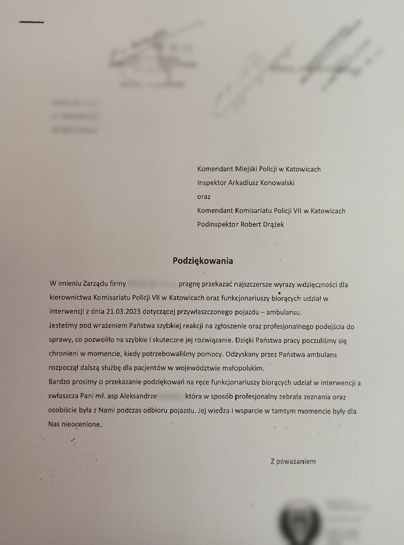 Na ręce Komendanta Miejskiego Policji w Katowicach wpłynęły podziękowania dla policjantów Komisariatu Policji VII w Katowicach, którzy odzyskali przywłaszczony ambulans.