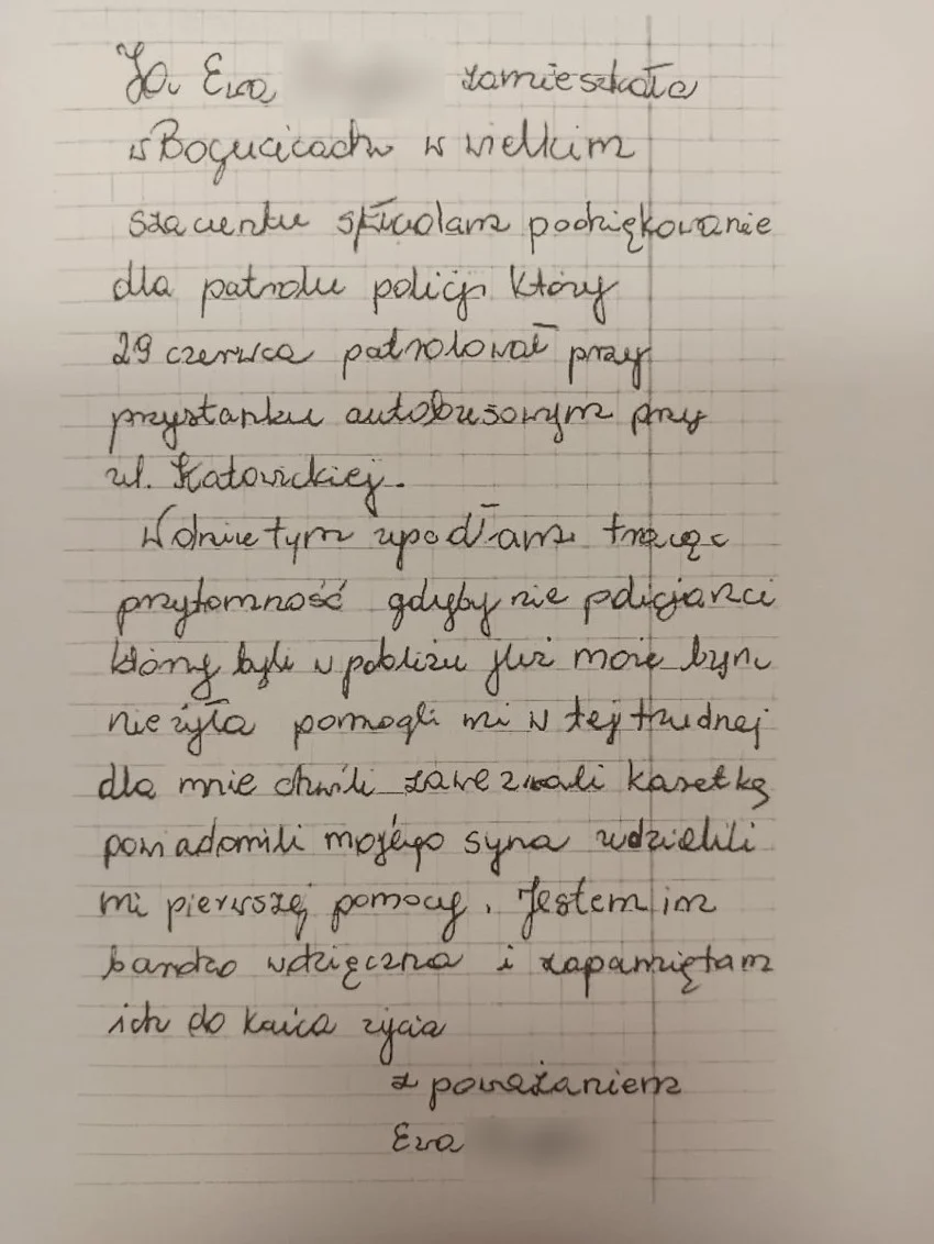Pani Ewa podziękowała w ten sposób mundurowym za pomoc, którą udzielili jej, kiedy tracąc przytomność na ulicy doznała urazu nogi. Po zanonimizowaniu danych publikujemy treść podziękowania.