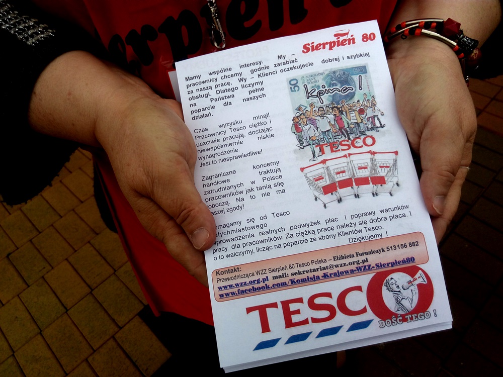 Protestują, a jednocześnie nie paraliżują pracy sklepu. Pracownicy sieci Tesco domagają się poważnego traktowania przez zarząd firmy oraz poprawy warunków pracy. Tesco zaproponowało swoim pracownikom po 50 zł (brutto!) podwyżki.