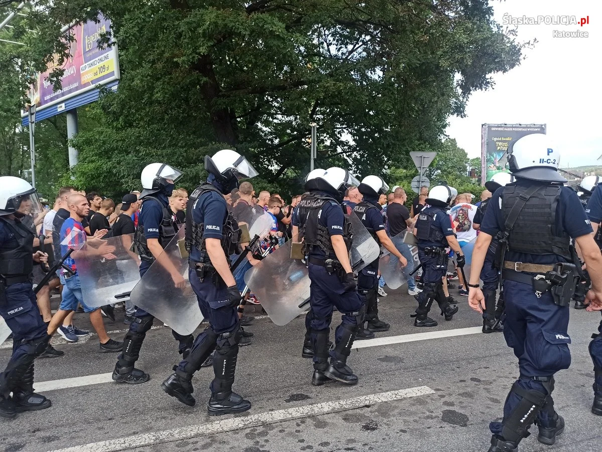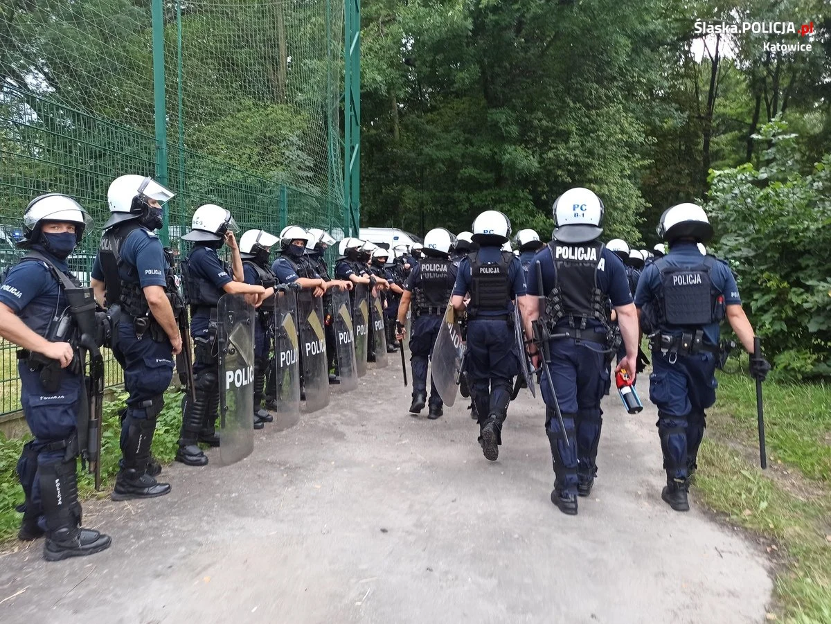 Policjanci z Komendy Miejskiej Policji w Katowicach wspólnie z mundurowymi z katowickiego oddziału prewencji i częstochowskiego samodzielnego pododdziału prewencji zabezpieczali w niedzielę mecz piłki nożnej. Podczas spotkania rozgrywanego na stadionie przy ul. Bukowej, GKS Katowice podejmował Arkę Gdynia. W trakcie zabezpieczenia dwie osoby złamały prawo.