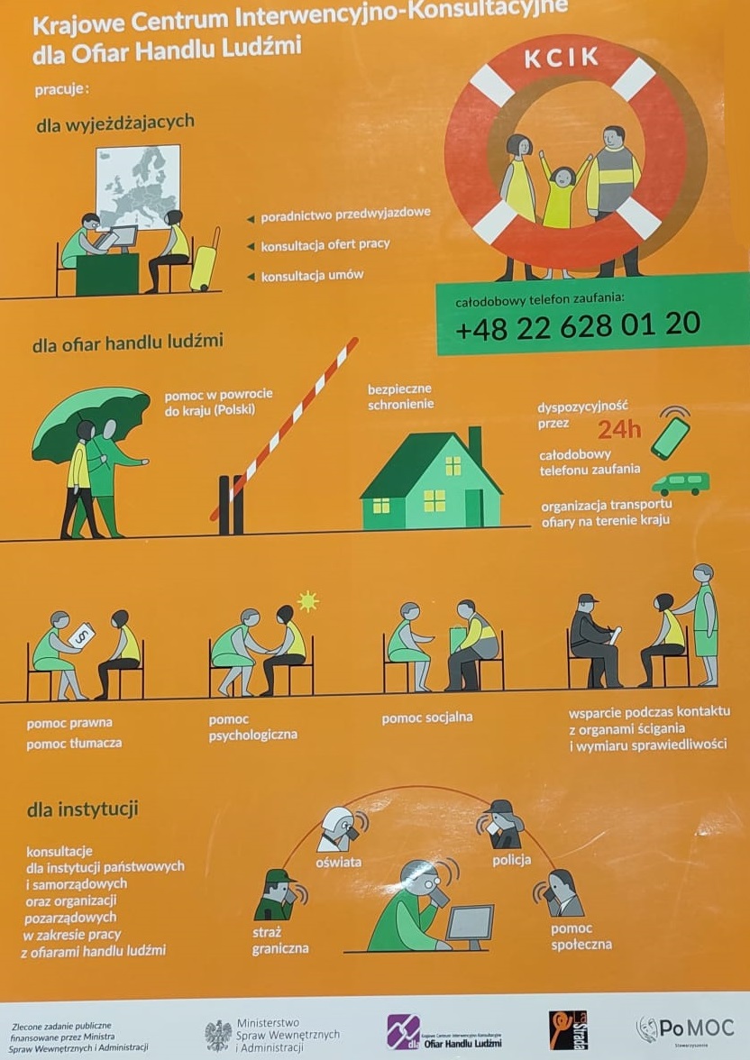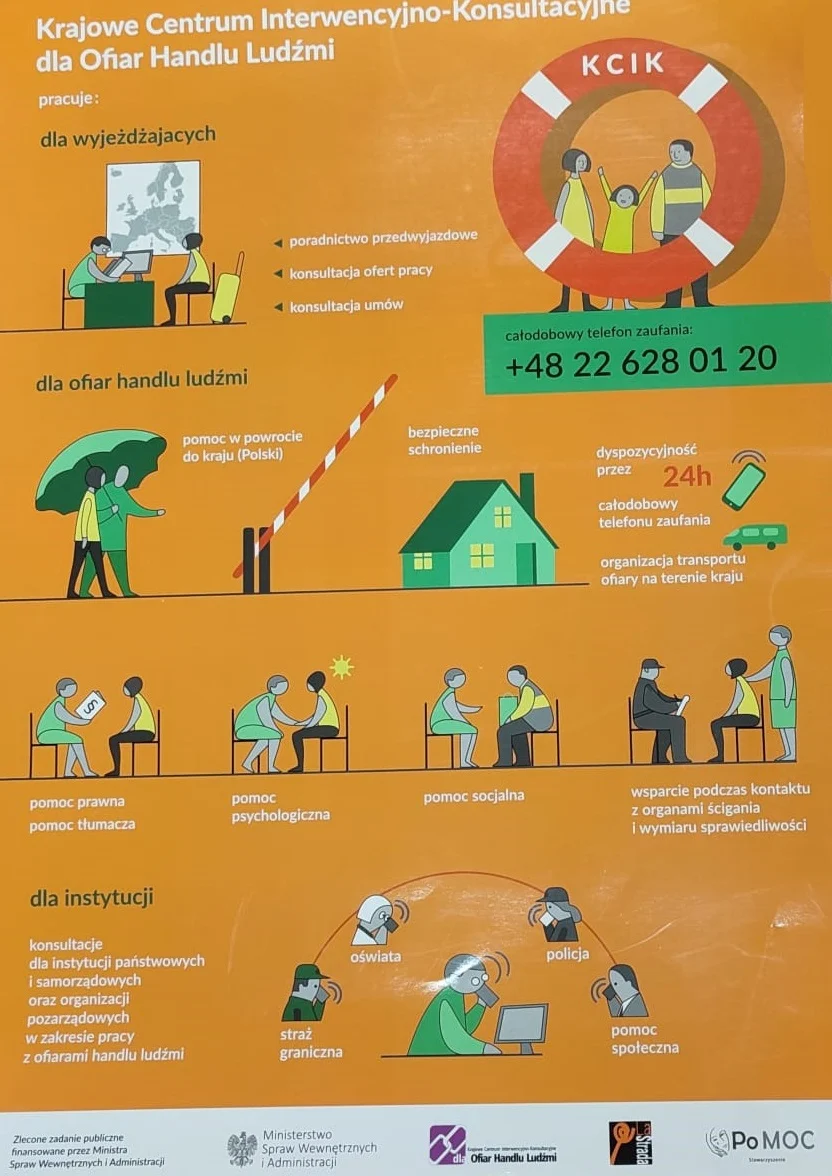 Podczas spotkań informacyjno – doradczych zorganizowanych w Powiatowym Urzędzie Pracy w Katowicach przy ul. Pośpiecha obywatele Ukrainy poznają nie tylko możliwości i warunki podejmowania pracy w Polsce, ale także zapoznają się z najważniejszymi prawami obowiązującymi w naszym kraju oglądając spot w języku ukraińskim pn. „Safe in Poland” oraz „Stop handlowi ludźmi” KGP. Ponadto policjantka przybliża uczestnikom spotkania czym jest handel ludźmi, jakie metody stosują przestępcy, a także jakie instytucje pomagają ofiarom tego przestępstwa. Wszyscy będący na spotkaniu wyposażyliśmy w materiały edukacyjne tj. broszury „Safe in Poland”, ulotki oraz karty ICE „w nagłym wypadku”. Pierwszym spotkaniom towarzyszyła wystawa przeciwdziałająca handlowi ludźmi.