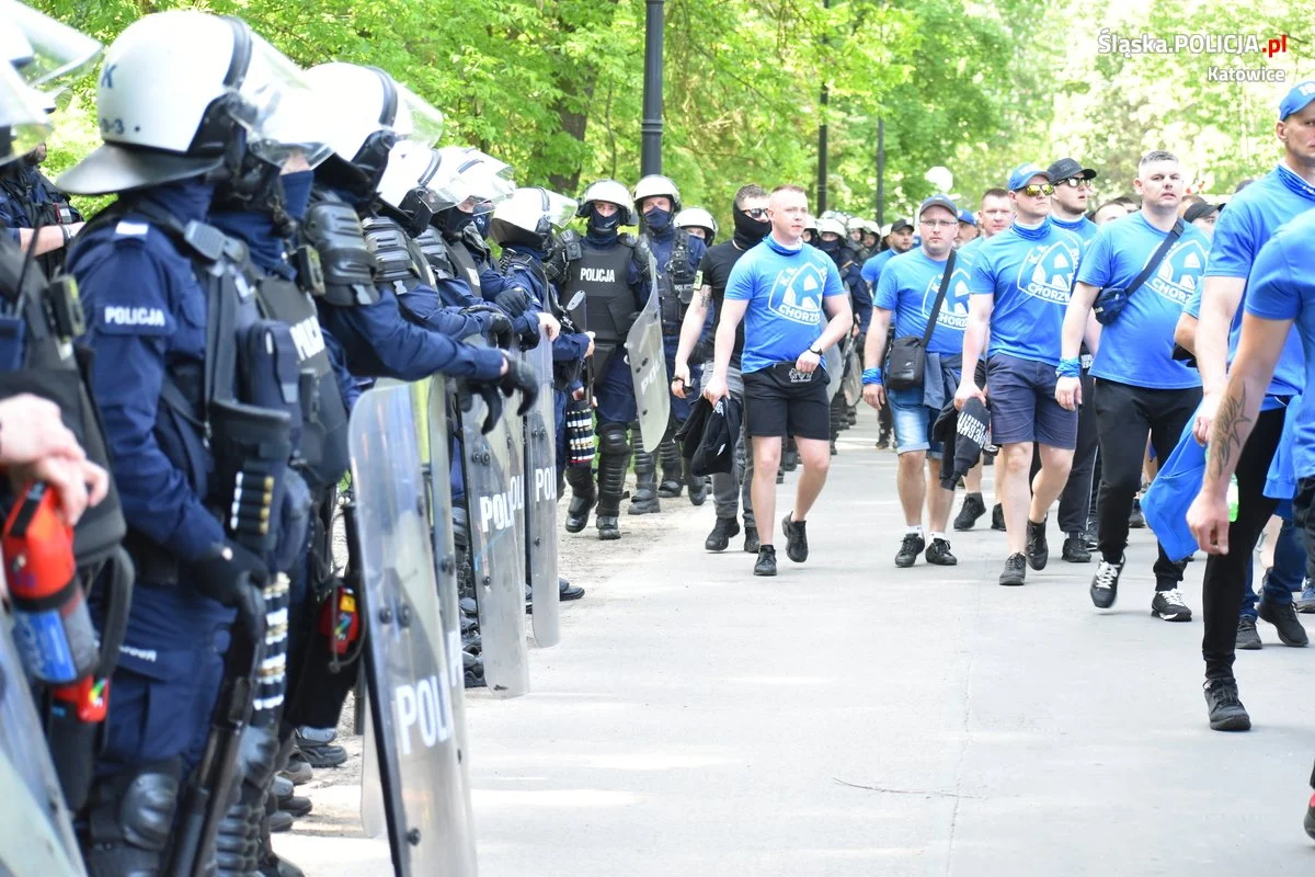 W drugiej połowie meczu, sympatycy katowickiego klubu rozłożyli wielkoformatową flagę i odpalili na stadionie środki pirotechniczne. Całe zajście zostało zarejestrowane przez mundurowych, którzy podczas zabezpieczenia meczu korzystali także z policyjnego drona.