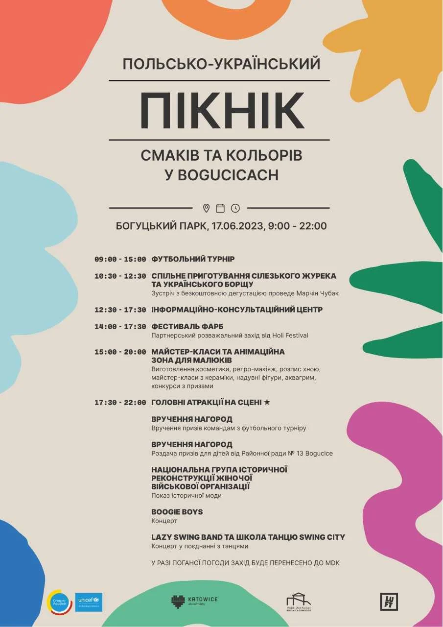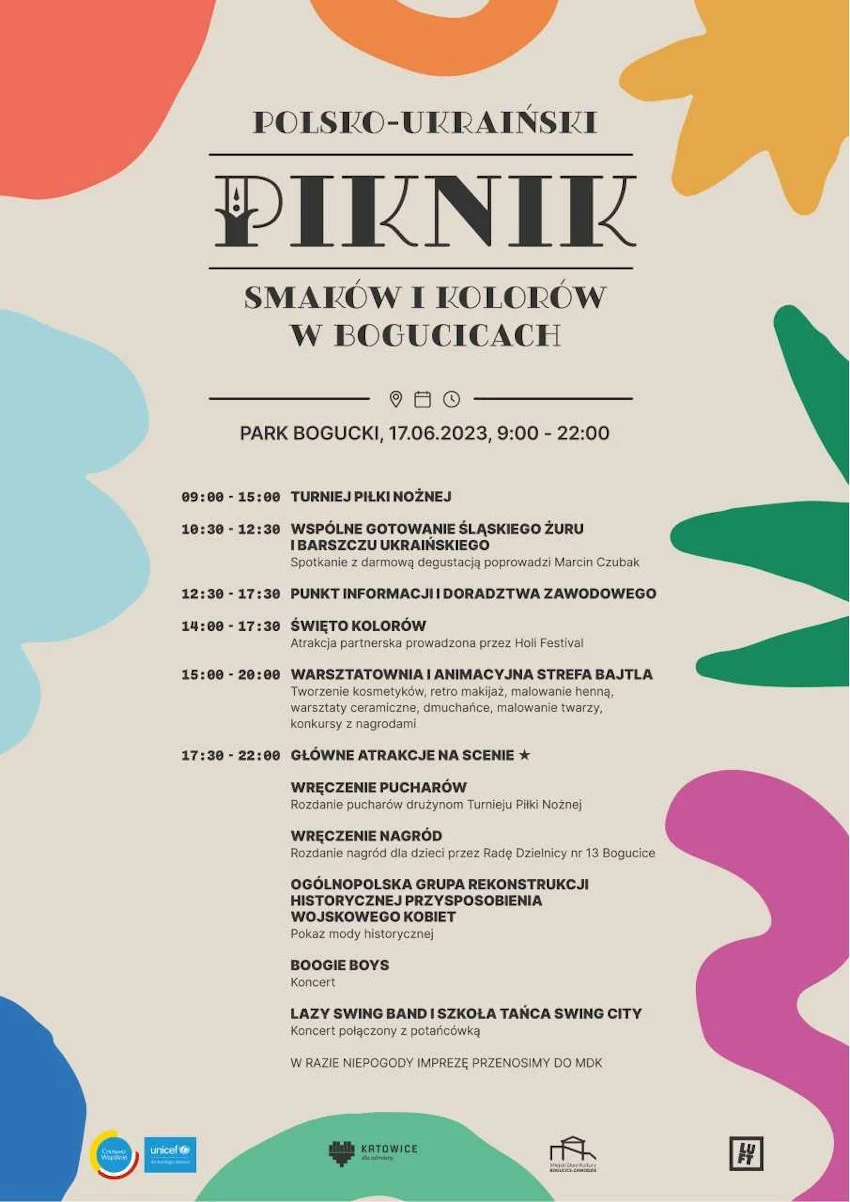 W najbliższą sobotę 17 czerwca br. na terenie Parku Boguckiego w Katowicach odbędzie się POLSKO-UKRAIŃSKI PIKNIK SMAKÓW I KOLORÓW. Początek imprezy zaplanowany jest na godzinę 9:00, a zakończenie przewidziane na 22:00, co oznacza, że będzie to dzień pełen pozytywnych wrażeń! Impreza ta współfinansowana jest ze środków Funduszu Narodów Zjednoczonych na Rzecz Dzieci (UNICEF).