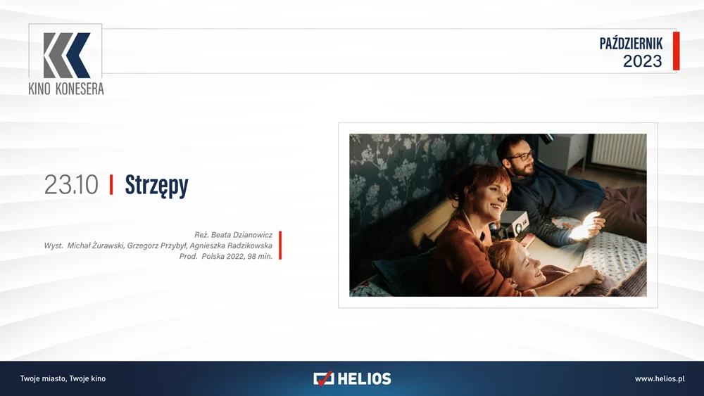 23 października Helios zaprasza na cykl Kino Konesera, w ramach którego zostanie wyświetlony polski dramat „Strzępy”. Rodzina mierzy się w nim z chorobą Alzheimera ukochanego dziadka – senior zaczyna łamać konwenanse i normy społeczne. Nasilające się symptomy sprawiają, że relacje w rodzinie wystawione są na próbę, a skrywane latami pretensje wychodzą na światło dzienne.