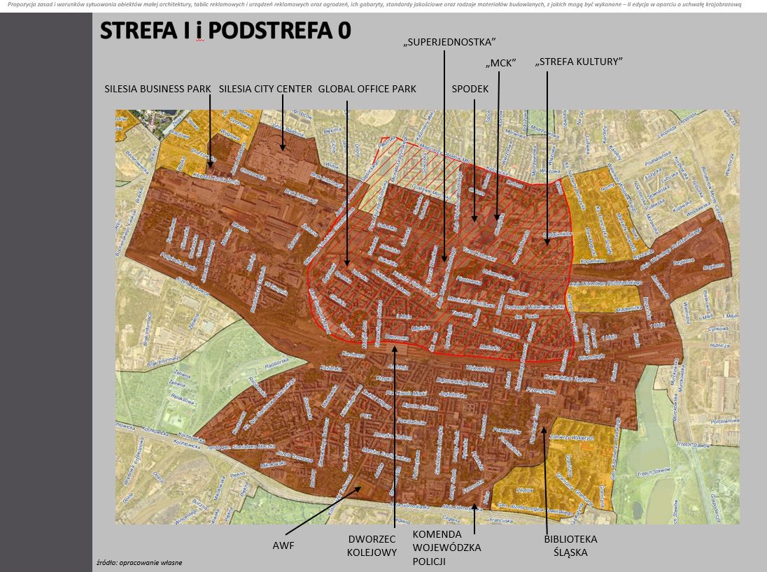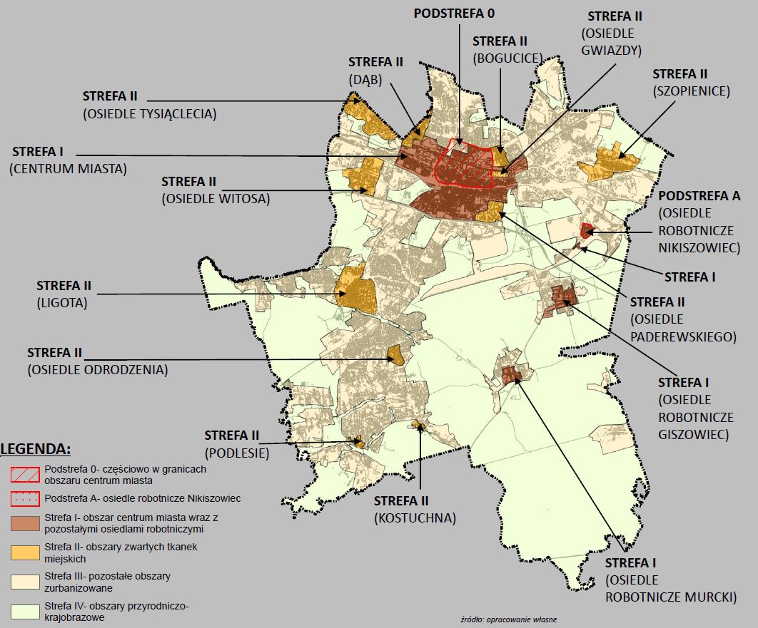 Strefa I obejmie obszar centrum miasta oraz „osiedla robotnicze”, przy czym wyróżnione zostaną: podstrefa 0 obejmująca część centrum Katowic oraz podstrefa A – osiedle robotnicze Nikiszowiec. Strefa II to obszary zwartych tkanek miejskich (np. osiedla: Witosa, Tysiąclecia i Paderewskiego, ale też Bogucice czy część Kostuchny), w strefie III znajdą się pozostałe tereny zurbanizowane, natomiast strefę IV stanowić będą obszary przyrodniczo-krajobrazowe.