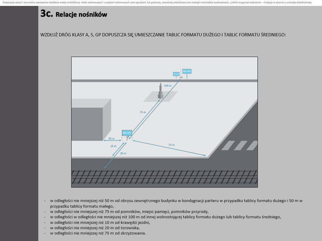 Zapisy uchwały regulują kwestie umieszczania szyldów w tzw. polu szyldowym, zgrupowania szyldów przy wejściu głównym do lokalu lub witrynie lokalu w strefie parteru. W projekcie określono zasady sytuowania i parametry dla różnych rodzajów reklam, w tym m.in. siatek reklamowych, semaforów, oraz różnych rozmiarów tablic reklamowych, takie jak odległości sytuowania nośników reklam od dróg, skrzyżowań czy pomników, miejsc pamięci itd.