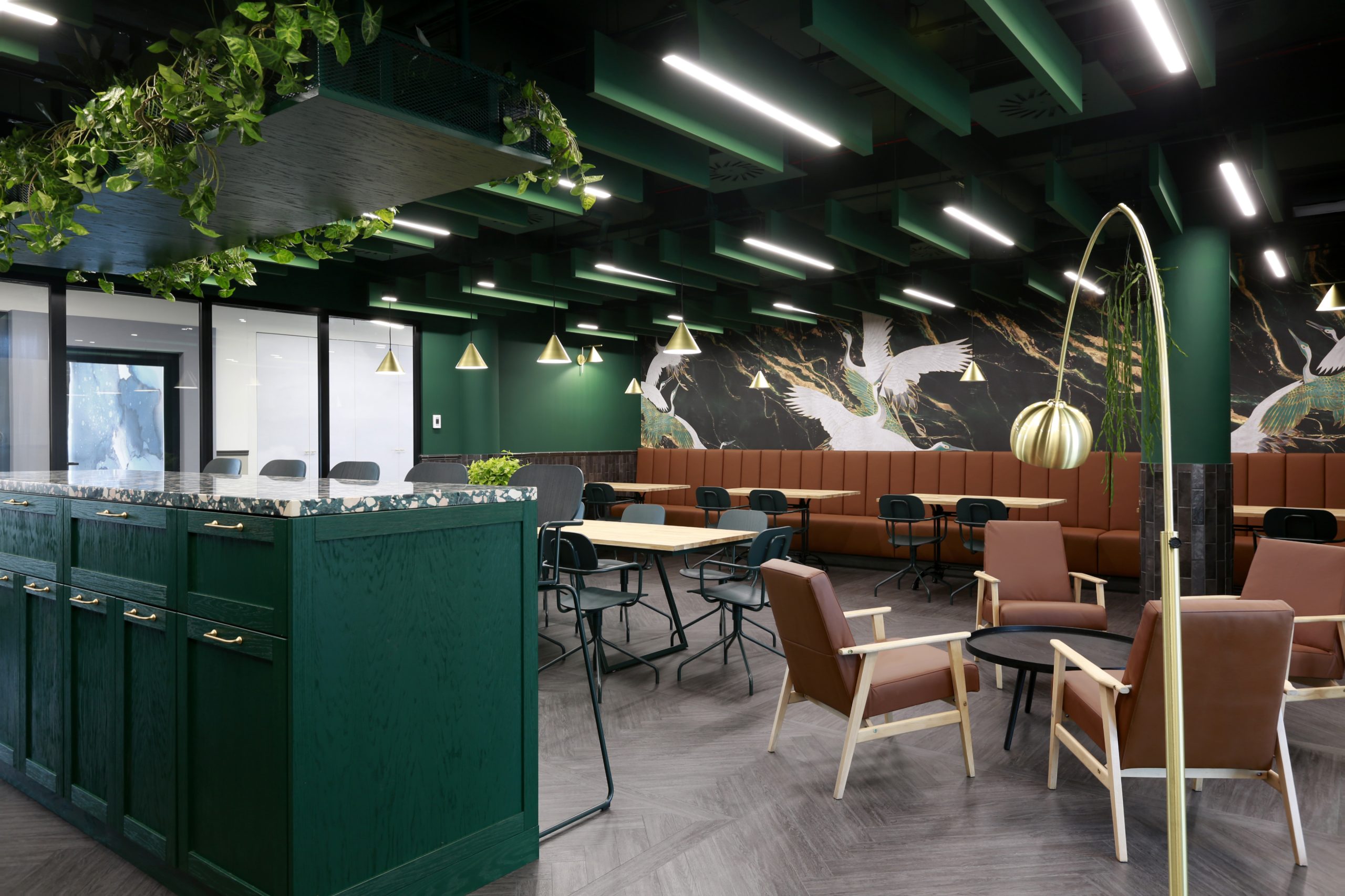 Wnętrze biura – zaprojektowane w stylu lounge i inspirowane stylem mid-century modern – przywołuje emocje związane z hotelowym lounge roomem, ulubioną restauracją lub kawiarnią, w której możemy spotkać się ze znajomymi, ale także oddać się kreatywnej pracy przy filiżance dobrej kawy. Elementy wystroju wnętrz, takie jak wygodne fotele, loże, wyspy barowe w strefach kafeterii, lamperie, oświetlenie, żywe rośliny, wysokiej jakości materiały wykończeniowe (m.in. naturalne drewno, mosiądz, terazzo, skóry, miękkie tkaniny), tworzą unikalny, restauracyjny klimat. Wychodząc na lunch podczas przerwy w pracy, możemy poczuć się jak