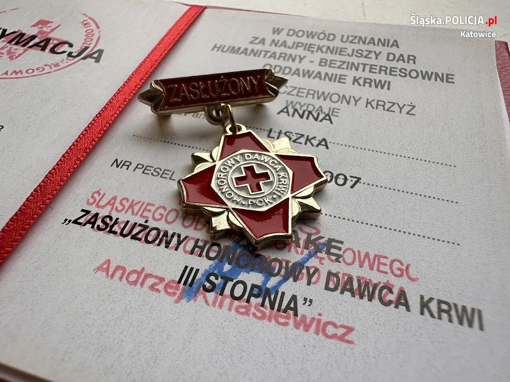 Pani Anna Liszka, która jest pracownikiem cywilnym katowickiej komendy, regularnie oddaje krew, ratując ludzkie życie. W sumie Pani Anna oddała już 5,5 litra krwi i została odznaczona brązową odznaką honorową „Zasłużony Honorowy Dawca Krwi III Stopnia”.