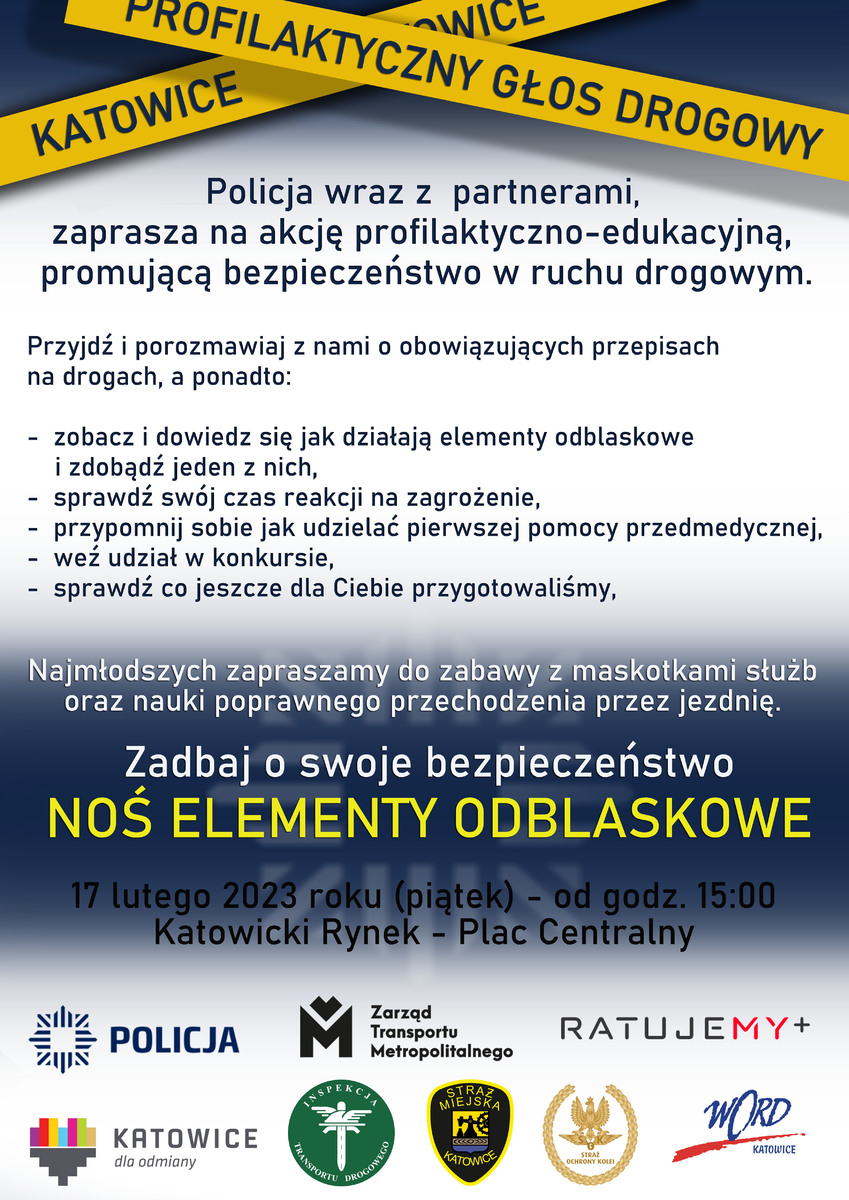 17 lutego 2023 r. katowiccy policjanci serdecznie zapraszają na katowicki Rynek, gdzie przeprowadzą akcję profilaktyczną pn: „Profilaktyczny Głos Drogowy”.