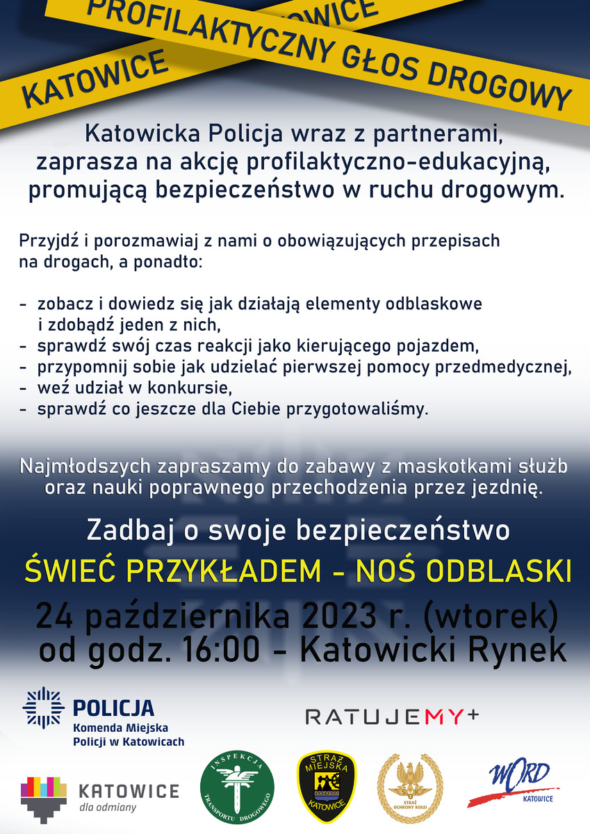 Już we wtorek, 24 października od godz. 16.00 policjanci zapraszają na katowicki Rynek, gdzie wspólnie ze Strażą Miejską w Katowicach, Zarządem Transportu Metropolitalnego, Regionalną Komendą Straży Ochrony Kolei w Katowicach, Stowarzyszeniem „Ratujemy+” odbędzie się wydarzenie pn.: “Profilaktyczny Głos Drogowy”.