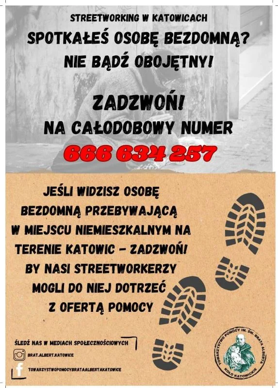 Towarzystwo Pomocy im. św. Brata Alberta – koło katowickie ze środków pozyskanych z Ministerstwa Rodziny i Polityki Społecznej, w ramach zadania: „Pokonać bezdomność. Program pomocy osobom bezdomnym” od września do końca tego roku realizuje na terenie Katowic projekt skierowany do osób bezdomnych, wykluczonych społecznie, pozostających poza systemem pomocy instytucjonalnej, przebywających w miejscach niemieszkalnych tj.: pustostanach, garażach, ogródkach działkowych, szałasach w lesie, skwerach, klatkach schodowych i innych miejscach na terenie całych Katowic.