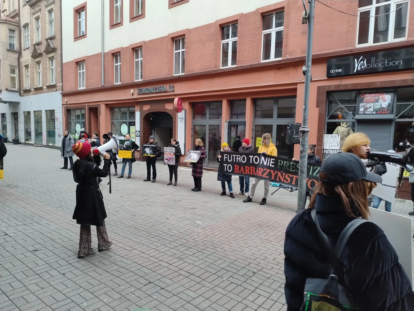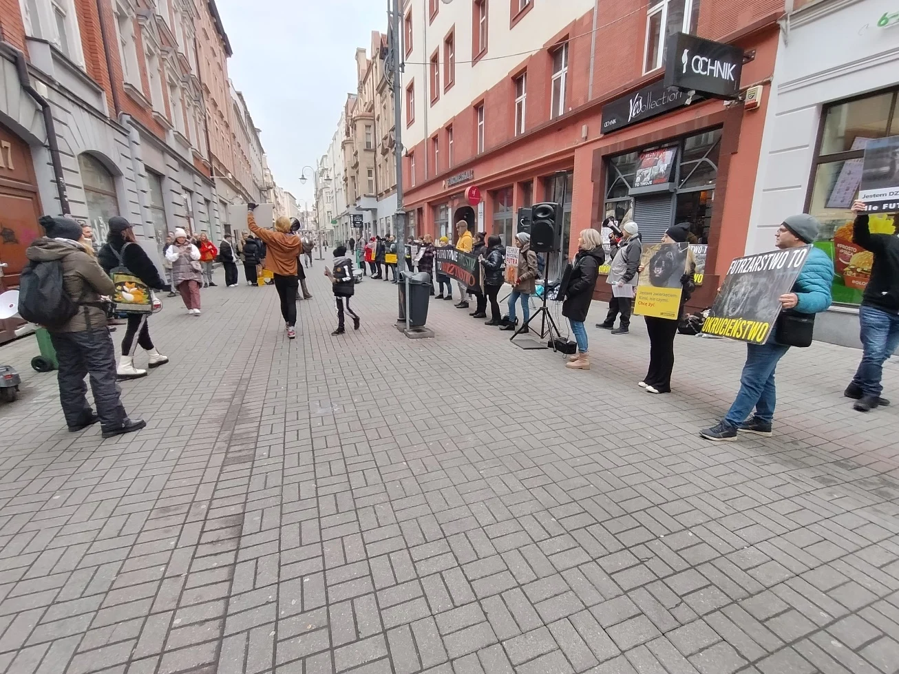 Dziś na ul. Staromiejskiej było bardzo głośno – trwał protest pod jednym z salonów firmy Ochnik. Aktywiści żądali, by firma wycofała się z inwestowania w branżę futrzarską.