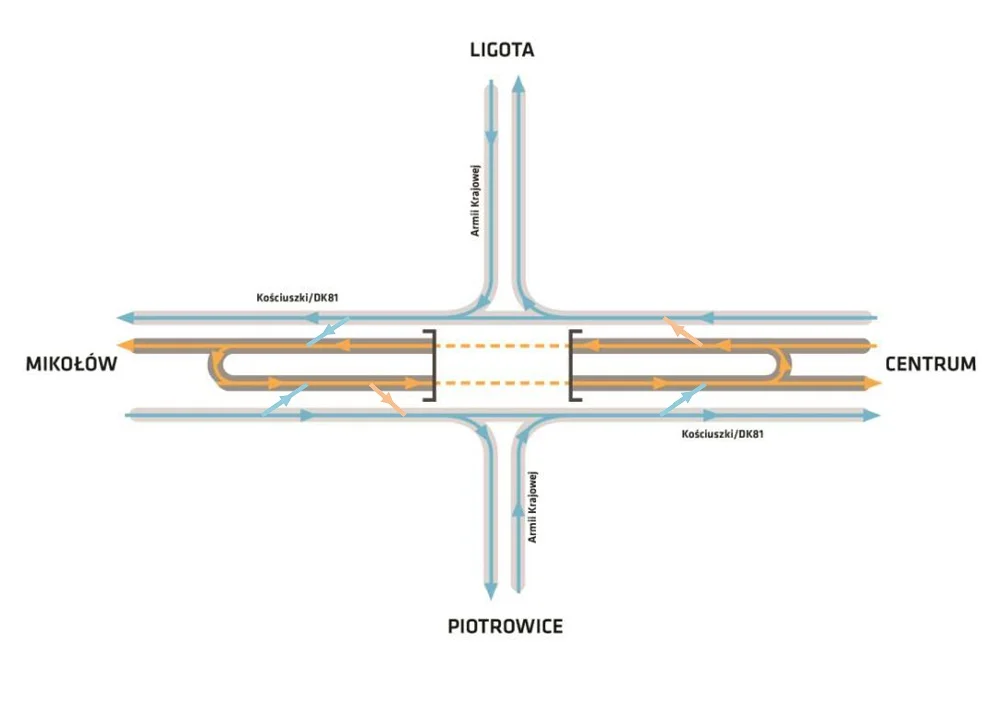 Jadąc od Centrum ul. Kościuszki do Piotrowic i Kostuchny kierowcy będą kierowani tunelem, następnie na nawrotkę i wjazd w ul. Armii Krajowej w prawo. Analogicznie kierowcy jadący od strony Mikołowa do Ligoty. Kierowcy jadący ulicą Armii Krajowej z kierunku Kostuchny i Piotrowic będą mogli wyjeżdżać w prawo na ul. Kościuszki i albo mogą kontynuować podróż na wprost do Centrum lub skorzystać z nawrotki i udać się w kierunku Ligoty lub Mikołowa. Analogiczna sytuacja dla kierowców jadących ulicą Armii Krajowej od strony Ligoty – wyjazd w prawo na ul. Kościuszki w kierunku do Mikołowa lub skorzystanie z nawrotki i wjazd z powrotem na ul. Armii Krajowej w kierunku Piotrowic lub dalej ul. Kościuszki w stronę Centrum.