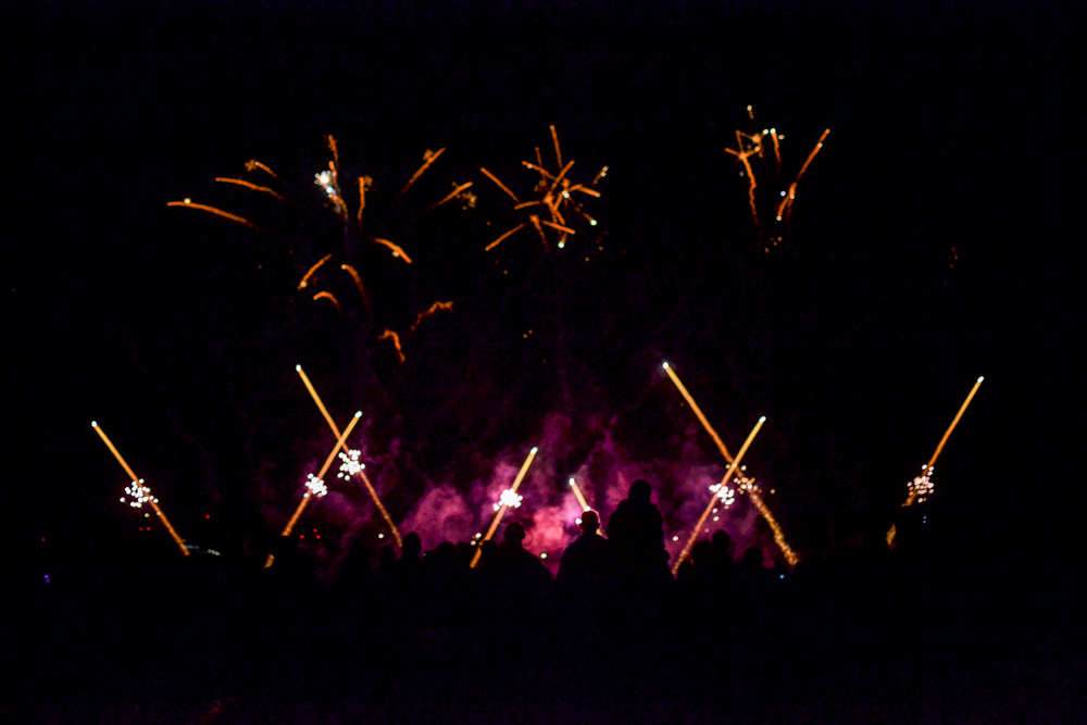 Punkt 21:40 rozpoczęły się pierwsze prezentacje laserowe (każdorazowo poprzedzały fireshow), a następnie zapoczątkowano to, na co czekali wszyscy zgromadzeni – fajerwerki. Trzy duże pokazy – kolejno o 21:40, 22:25 i 23:15 rozświetliły niebo, hukiem oznajmiając swoją obecność. Całość słyszana była nawet w okolicy Ligoty, a nawet dzielnic południowych (na co sporo osób narzekało).