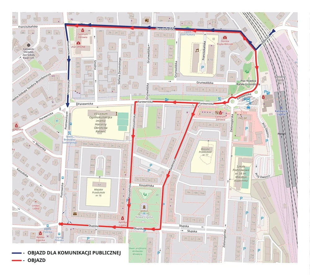 Objazd dla komunikacji autobusowej poprowadzony będzie ul. Franciszkańską, a następnie do ul. Piotrowickiej, natomiast objazd dla pozostałych samochodów kierowany będzie zarówno na ul. Franciszkańską jw., jak również ul. Świdnicką i ul. Koszalińską, a następnie ul. Słupską do ul. Piotrowickiej. W załączniku znajduje się mapka z zaznaczonymi objazdami.