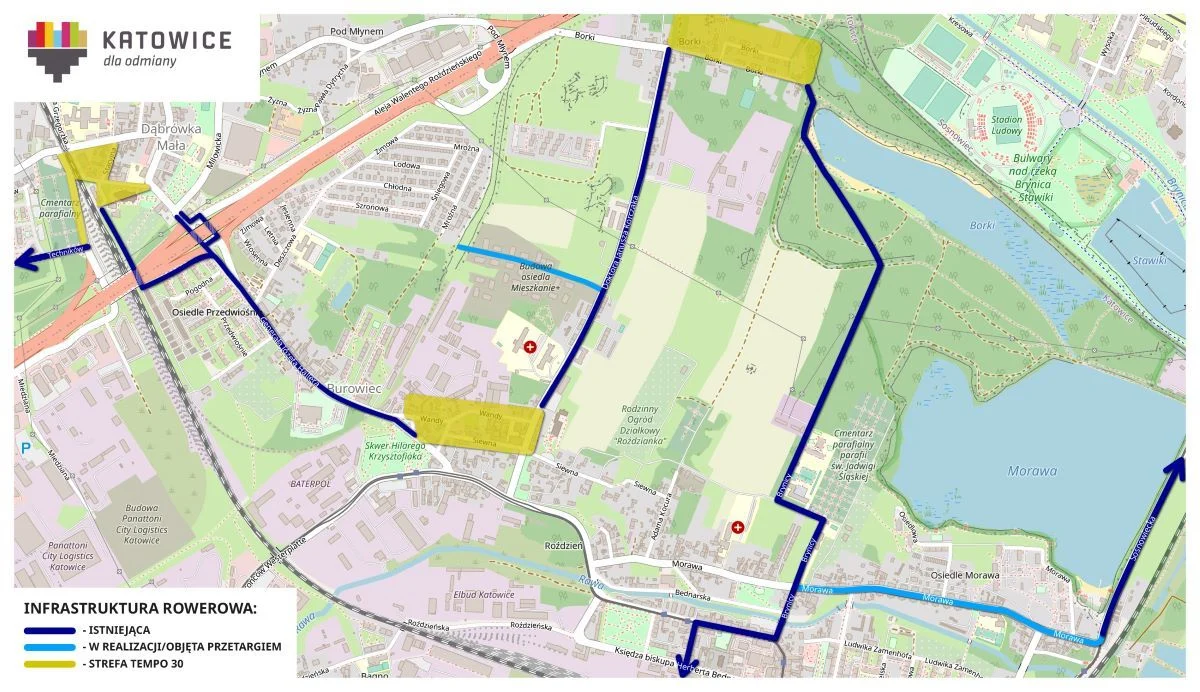 Urząd Miasta Katowic ogłosił przetarg na budowę drogi dla rowerów wzdłuż ul. Morawa, która połączy istniejące trasy od ul. Brynicy do ul. Sosnowieckiej. Inwestycja o długości niespełna kilometra obejmie także budowę chodnika, instalację oświetlenia oraz przebudowę infrastruktury odwodnieniowej. Droga zakończy się przy zjeździe na teren stanicy żeglarskiej przy stawie Morawa. Oferty od zainteresowanych wykonawców przyjmowane są do 11.10.2024 r. Na realizację inwestycji, łącznie z odbiorami, wybrany podmiot będzie miał 12 miesięcy.