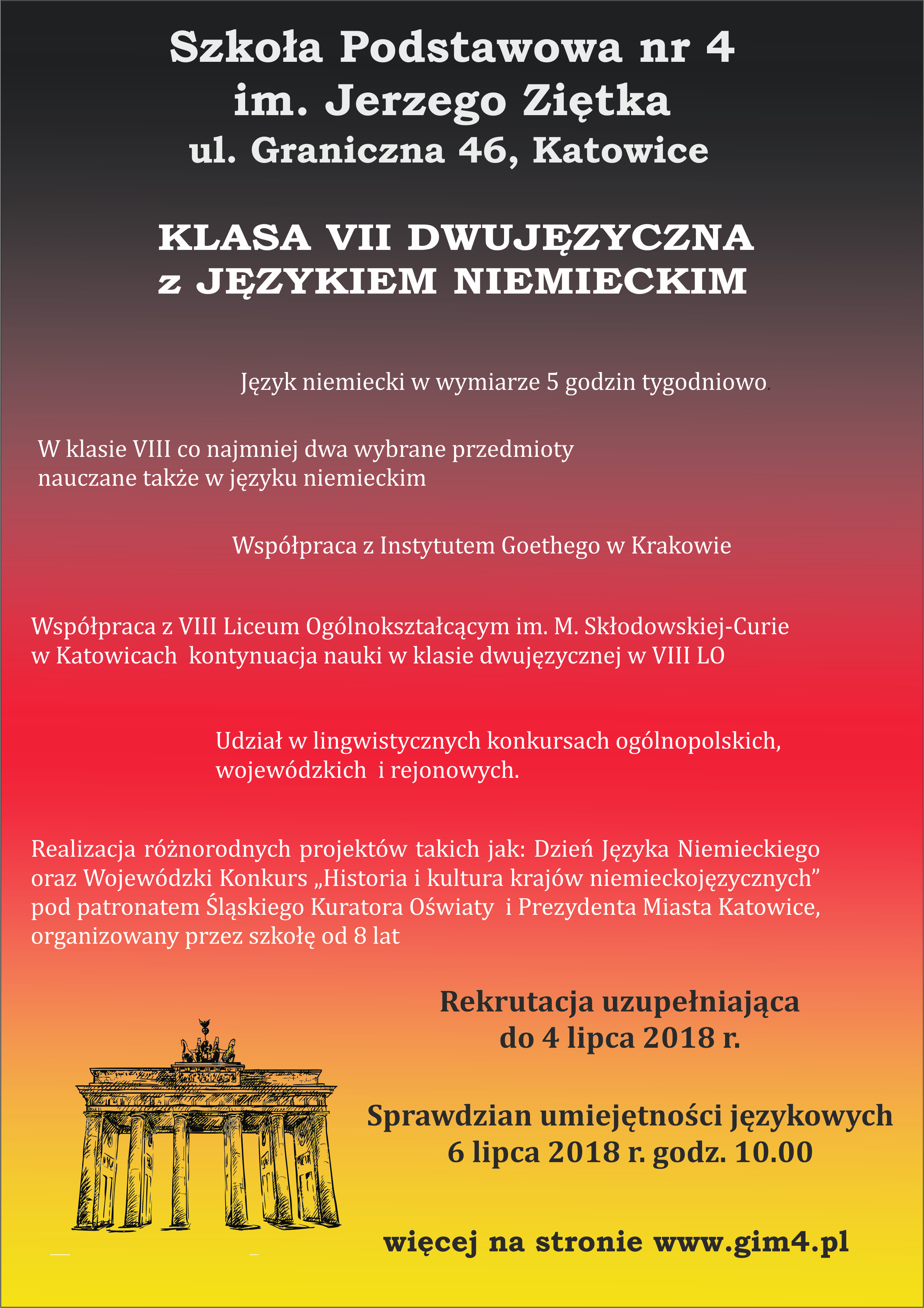 - w Szkole Podstawowej Nr 4 im. Jerzego Ziętka w Katowicach z językiem niemieckim,