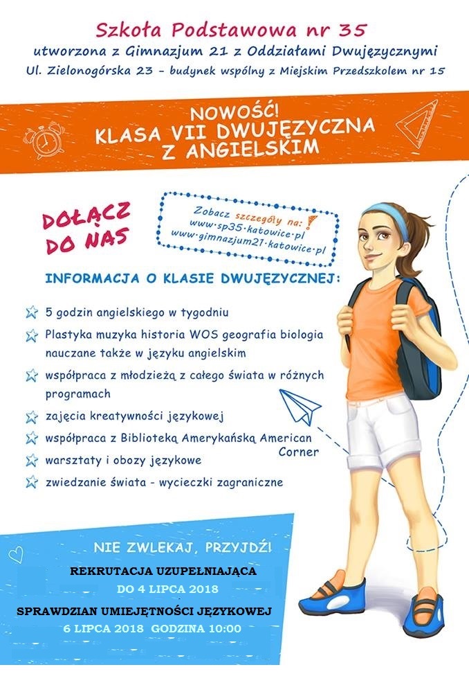 Rekrutacja uzupełniająca rozpocznie się 2 lipca, a sprawdzian predyspozycji językowych odbędzie się w tych szkołach 6 lipca 2018. Szczegółowe informacje o nauczaniu dwujęzycznym i programie klas znajdują się na stronach internetowych szkół.