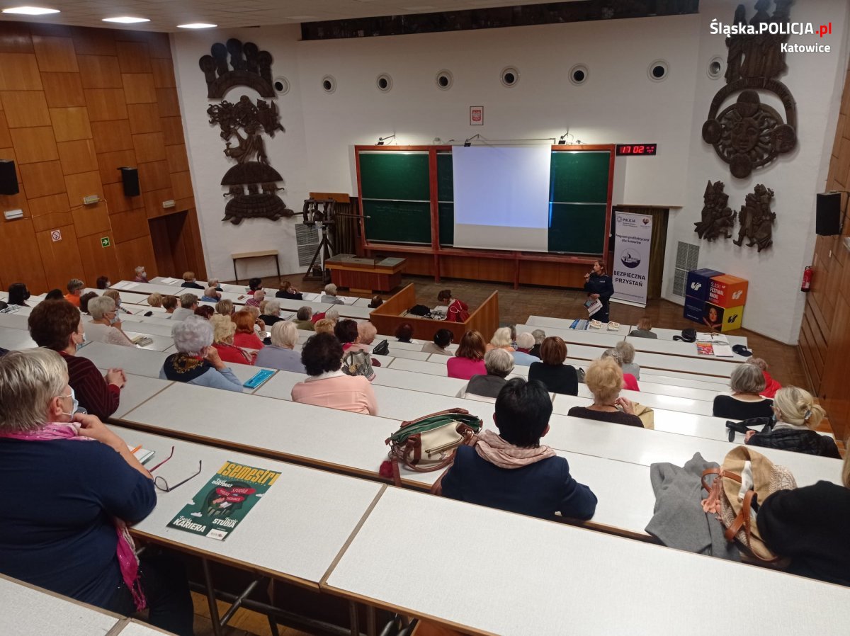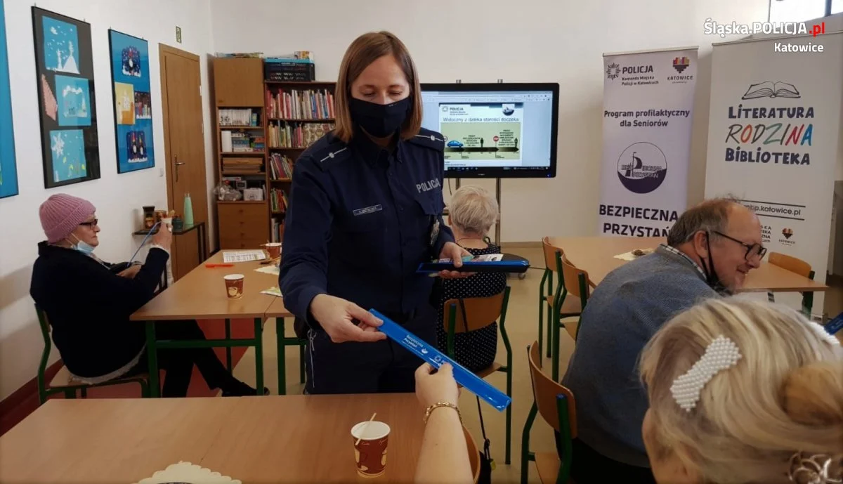 „Seniorze! W rozmowie telefonicznej przejmij kontrolę! Weryfikuj tożsamość! Nie przekazuj osobie nieznajomej swoich pieniędzy!” apelowała katowicka policjantka podczas cyklu spotkań zorganizowanych przy współpracy ze Stowarzyszeniem FAMI.LOCK, Miejskimi Bibliotekami Publicznymi w Katowicach oraz Uniwersytetem Trzeciego Wieku w Katowicach.