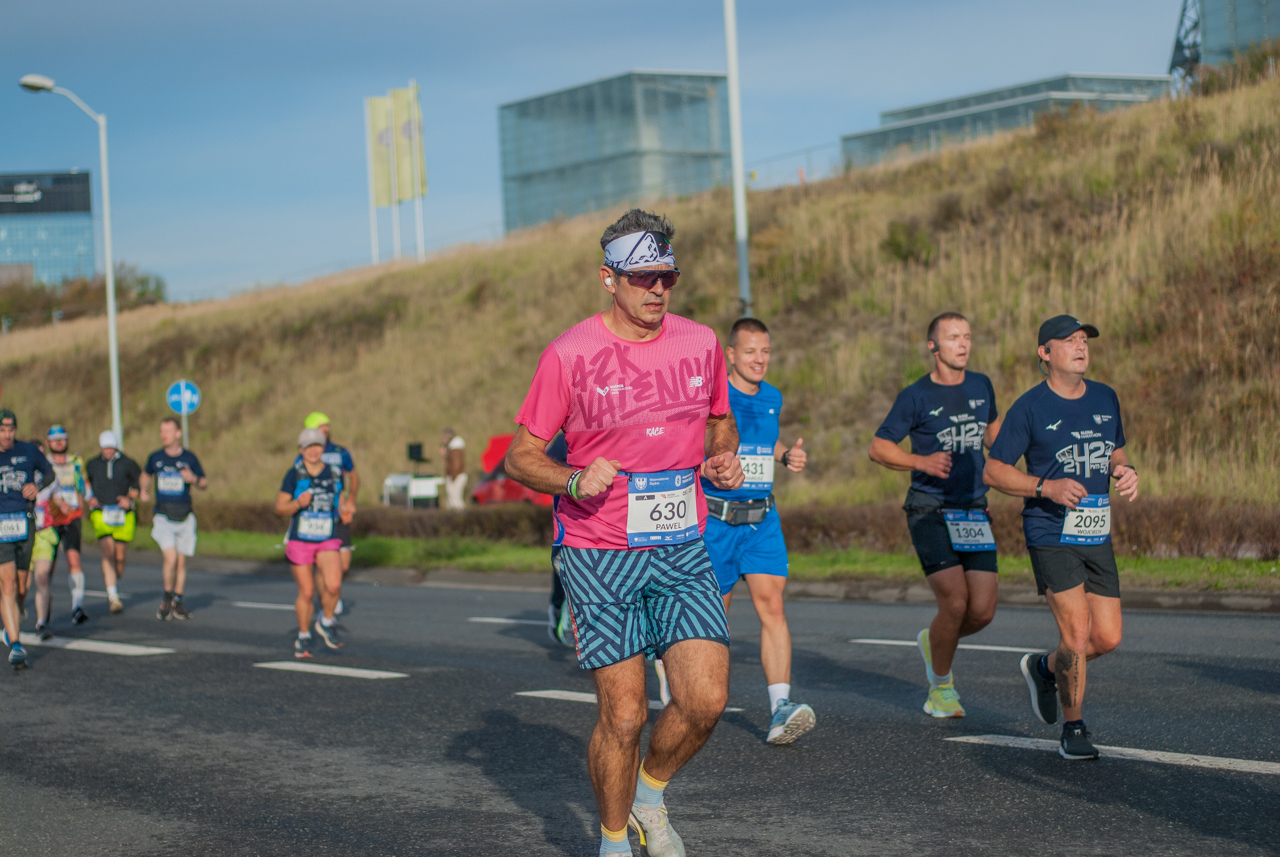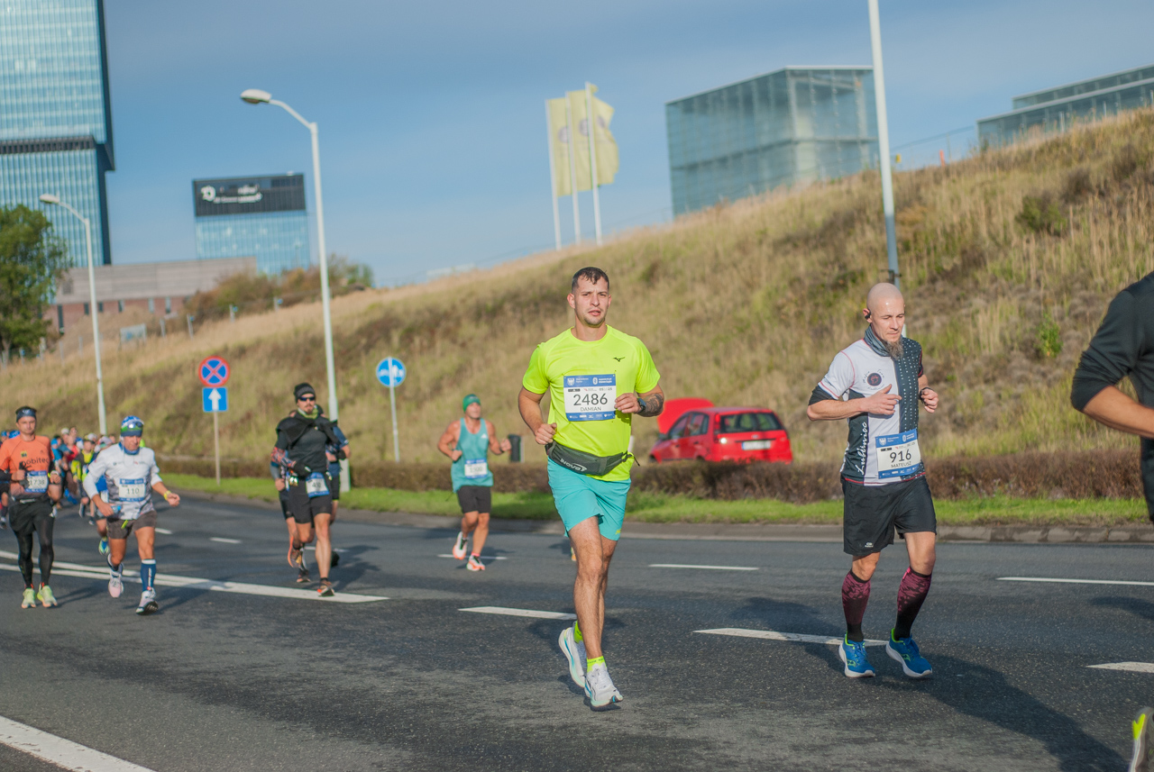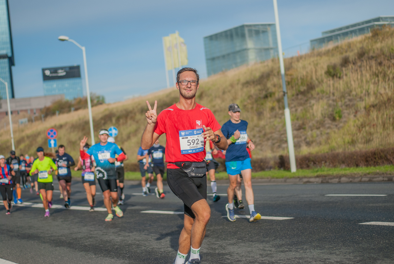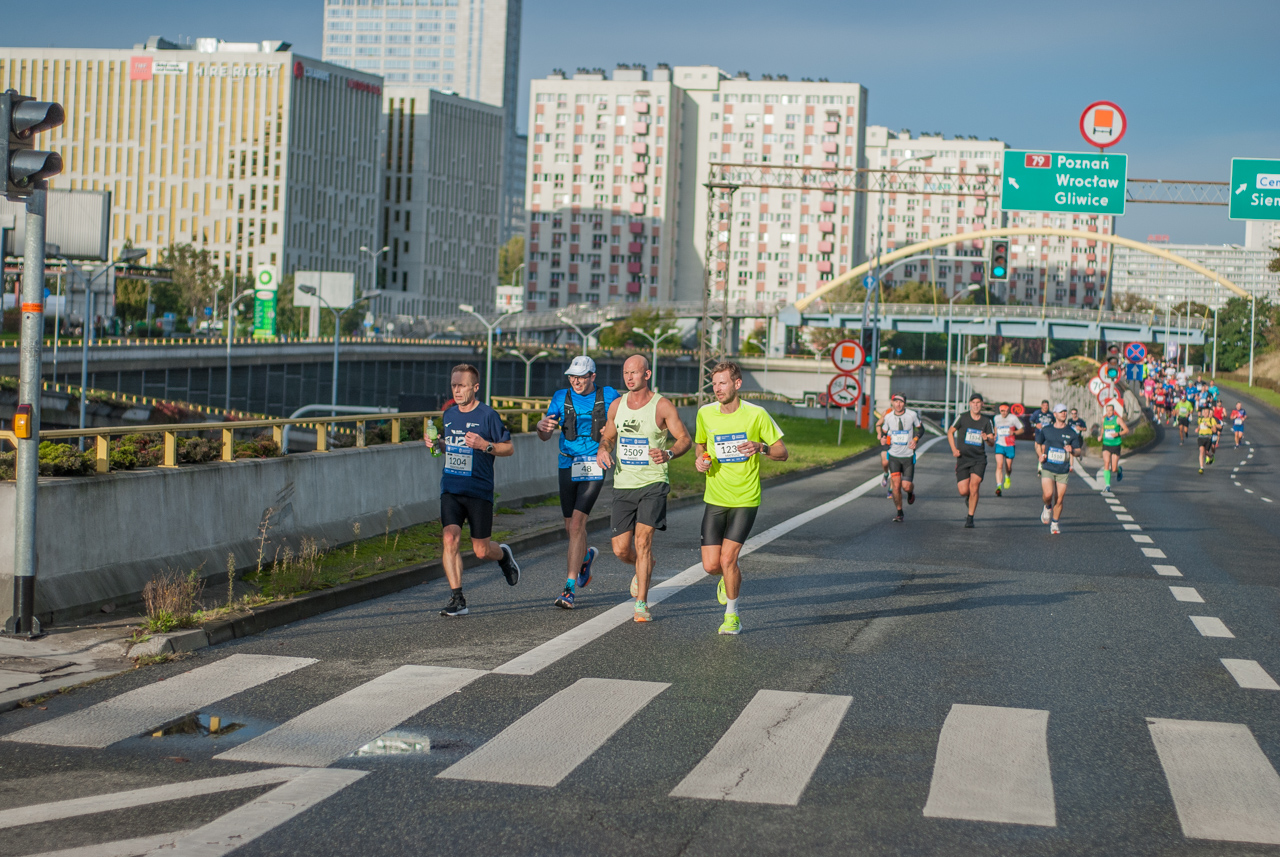 Punktualnie o 8:00 ruszyła pierwsza grupa maratończyków, a po niej kolejne, falami. Tradycyjnie już, jak co roku, zasadziliśmy się z aparatem fotograficznym u zbiegu ulicy Dobrowolskiego i alei Roździeńskiego, gdzie pierwsi zawodnicy na trasie maratonu dotarli mniej więcej po 15 minutach. Kilka minut później pojawił się kolorowy tł um biegaczy.