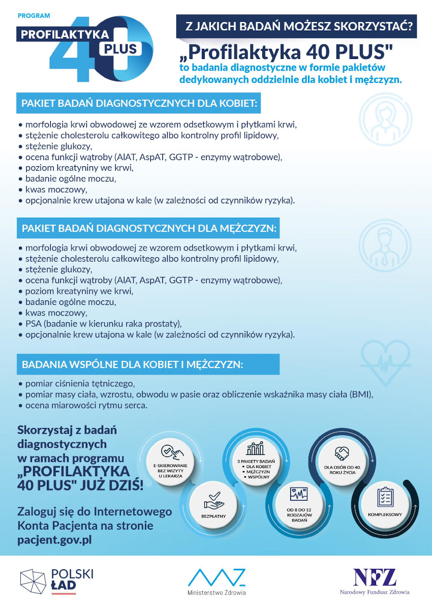 Szczegóły na temat programu: https://www.gov.pl/web/zdrowie/profilaktyka-40-plus