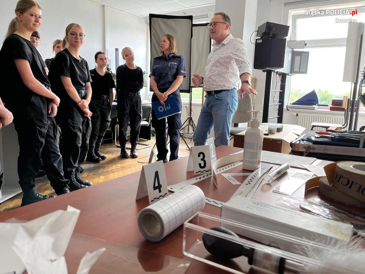 Następnym przystankiem zwiedzania katowickiej jednostki był Referat Techniki Kryminalistycznej, gdzie uczniowie dowiedzieli się, jakie występują rodzaje śladów i w jaki sposób są zabezpieczane. Ponadto mieli możliwość samodzielnego ujawnienia śladów daktyloskopijnych.