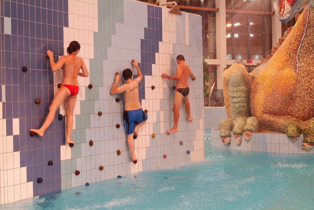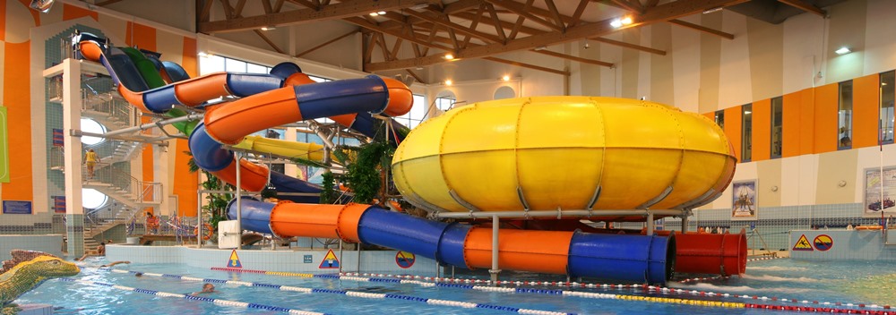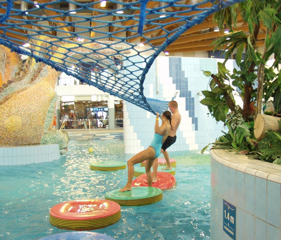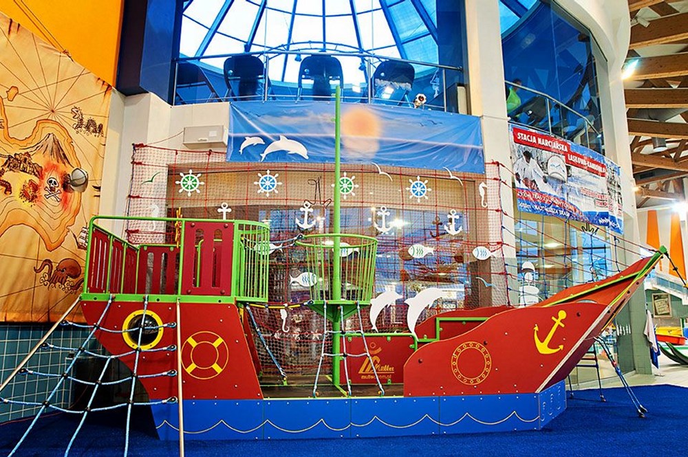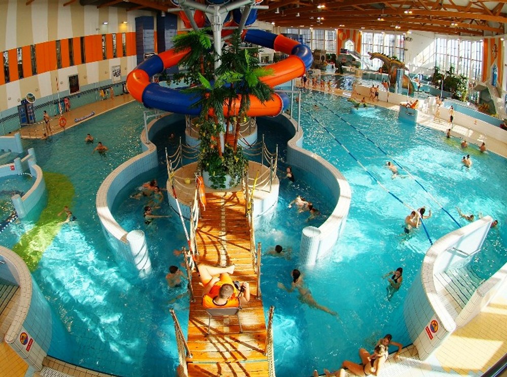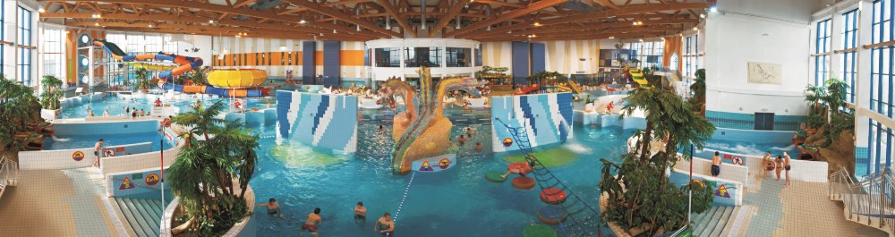 W hali basenowej długie, zakręcone zjeżdżanie o łącznej długości ponad 800 m! Mamy do dyspozycji trzy baseny o łącznej długości 2000 m², z pełną gamą atrakcji takich jak: bicze wodne, stacje hydromasaży dennych oraz bocznych, leżanki z hydromasażami, Rwąca Rzeka, Tęczowa Ścieżka, ścianki wspinaczkowe, miejsca do sportów wodnych (siatkówka, koszykówka, piłka wodna), tory do pływania. Mamy też mnóstwo atrakcji dla Dzieci w osobnej strefie. Znajdują się tam: Statek Piracki, Wyspa Piratów z trzema minizjeżdżalniami i najnowszą Tęczową Zjeżdżalnią. Zjeżdżalnie są zróżnicowane wiekowo i stopniowane pod względem trudności. Jesienną rozgrzewkę zapewnią nam jacuzzi z wodą solankową oraz nowoczesny zespół saunowy (sauny parowe i suche, sauna solna i studnia lodowa).