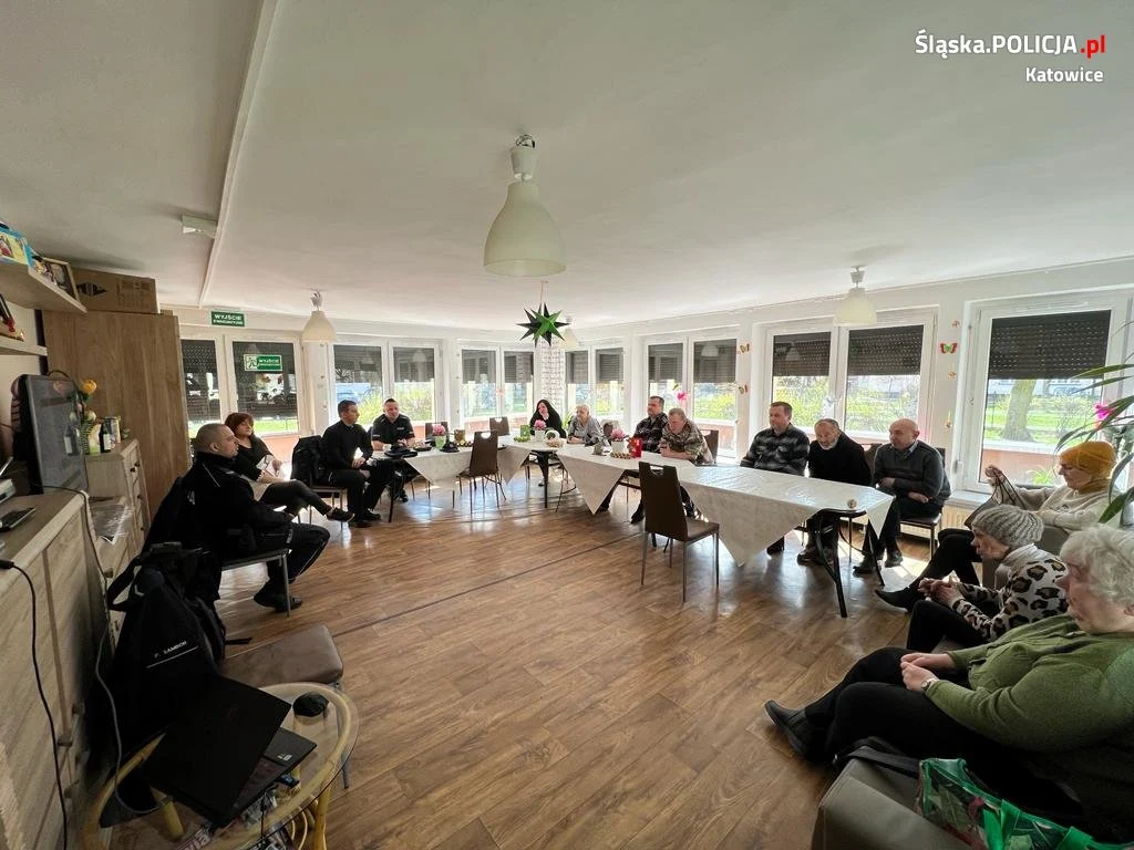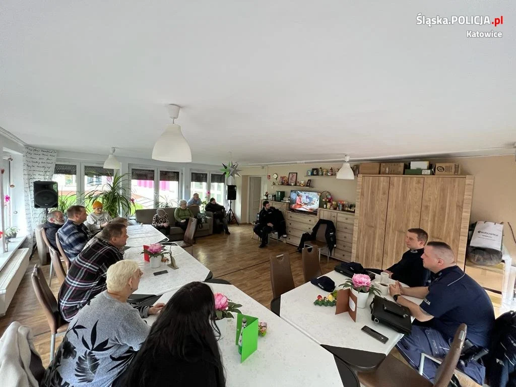 St. sierż. Olaf Ziorko wspólnie z dzielnicowymi Komisariatu Policji III w Katowicach asp. Tomaszem Stolarskim, mł.asp. Tomaszem Chlebkiem oraz sierż. Piotrem Samborem spotkali się z mieszkańcami Dziennego Domu Pomoc Społecznej mieszczącego się przy ul. Świdnickiej. Tematem rozmów było bezpieczeństwo seniorów ze szczególnym uwzględnieniem oszustw, gdzie pokrzywdzonymi są osoby starsze. Policjanci przedstawili schemat działania przestępców wykorzystujących metodę na fałszywego policjanta czy też wnuczka.